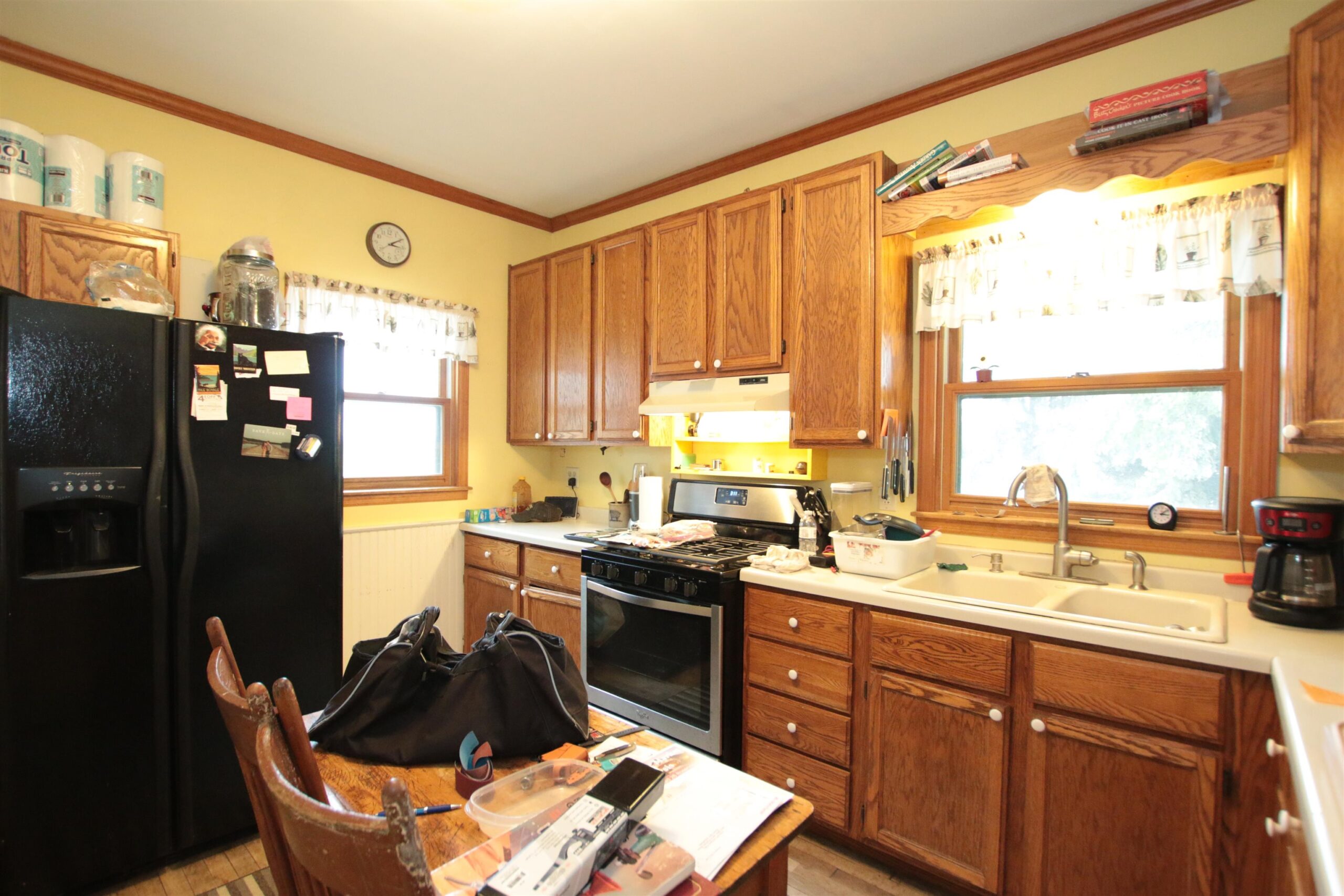 Range, refrigerator, window treatments, water-softener, washer, dryer, microwave, pellet stove, security system, sink in basement.