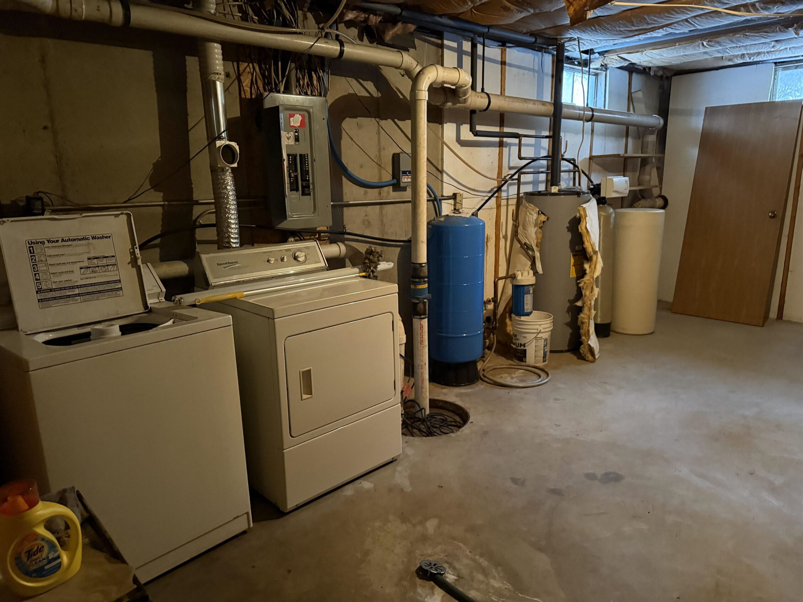 Stove, refrigerator, dishwasher, freezer, washer, dryer, wall hanging in basement