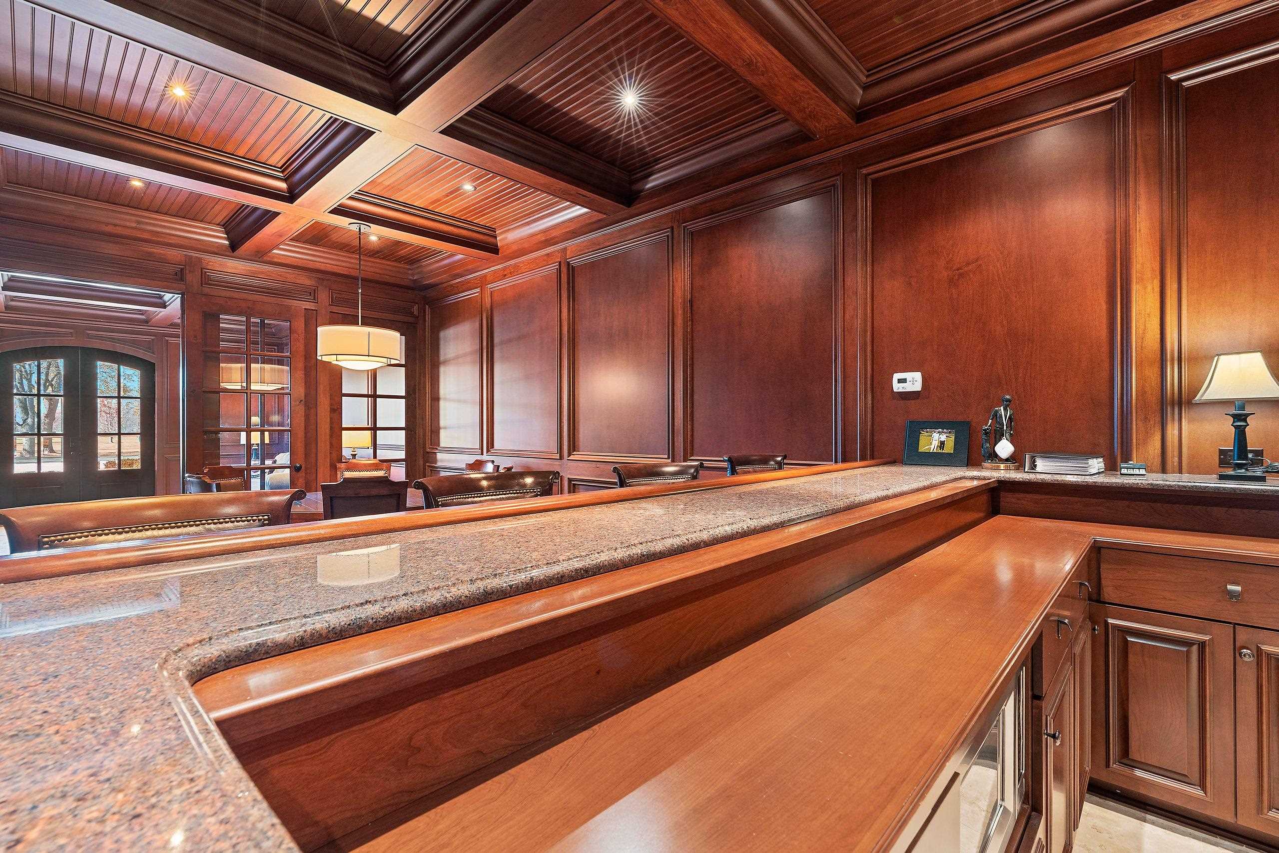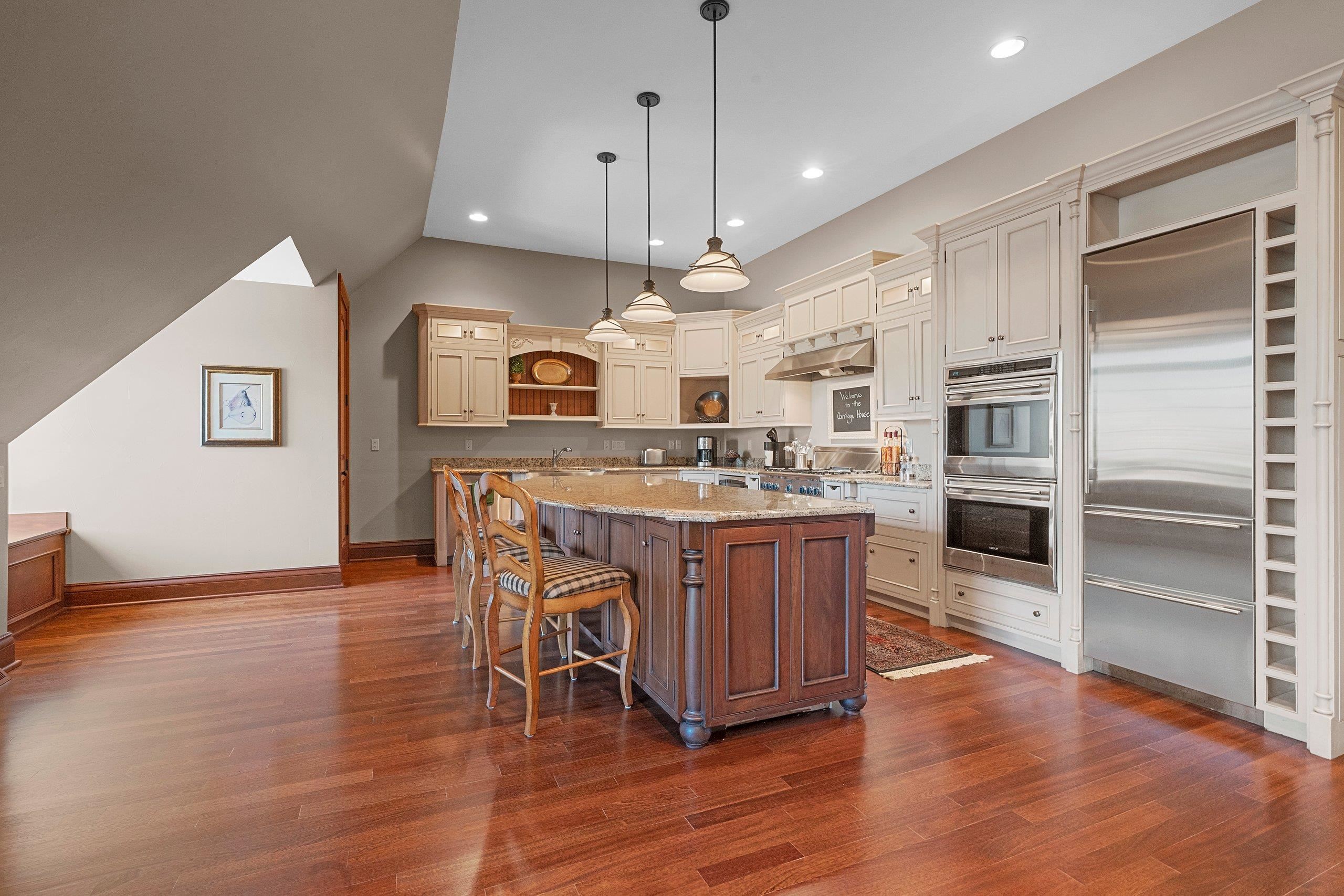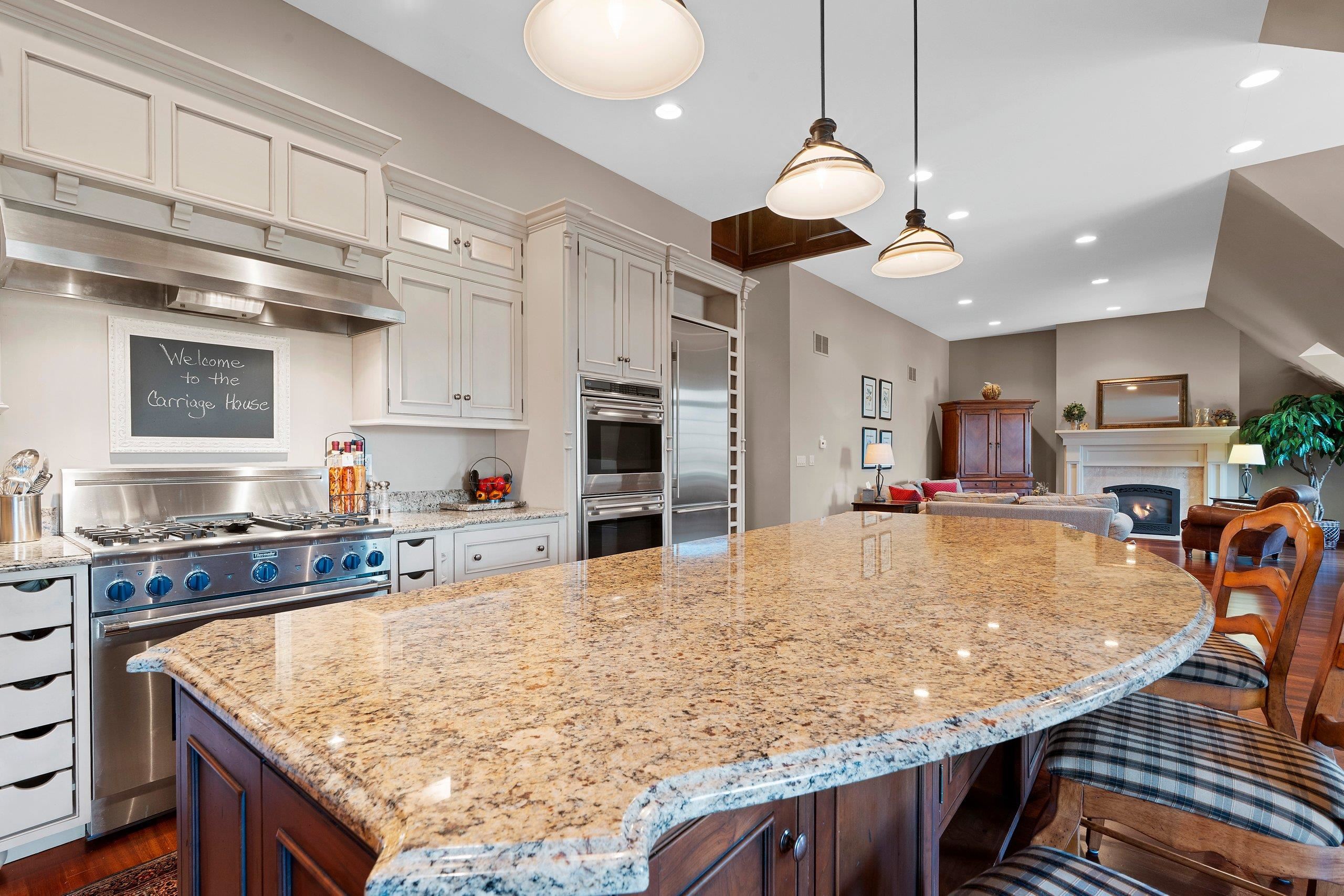Welcome to the “Carriage House.” This truly one-of-a-kind design is sure to impress. The main level features a stunning living room and bar area w/rich dark woodwork, coffered ceilings, recessed lighting, & a granite bar that gives off a true top-shelf vibe, perfect place to unwind & entertain. This level is flanked by 2 separate heated 4-car garages, ideal for the car enthusiast. A half bath, office, and hobby room (3rd bedroom) complete the main floor. Upstairs, you’ll find volume ceilings, beautiful hardwood floors, 8' solid doors, 7" trim. The spacious kitchen offers high-end appliances and a large granite center island that opens to a cozy living room /FP. Upper level also includes 2 generous bedrooms, W/WIC and their own private full baths & Laundry.