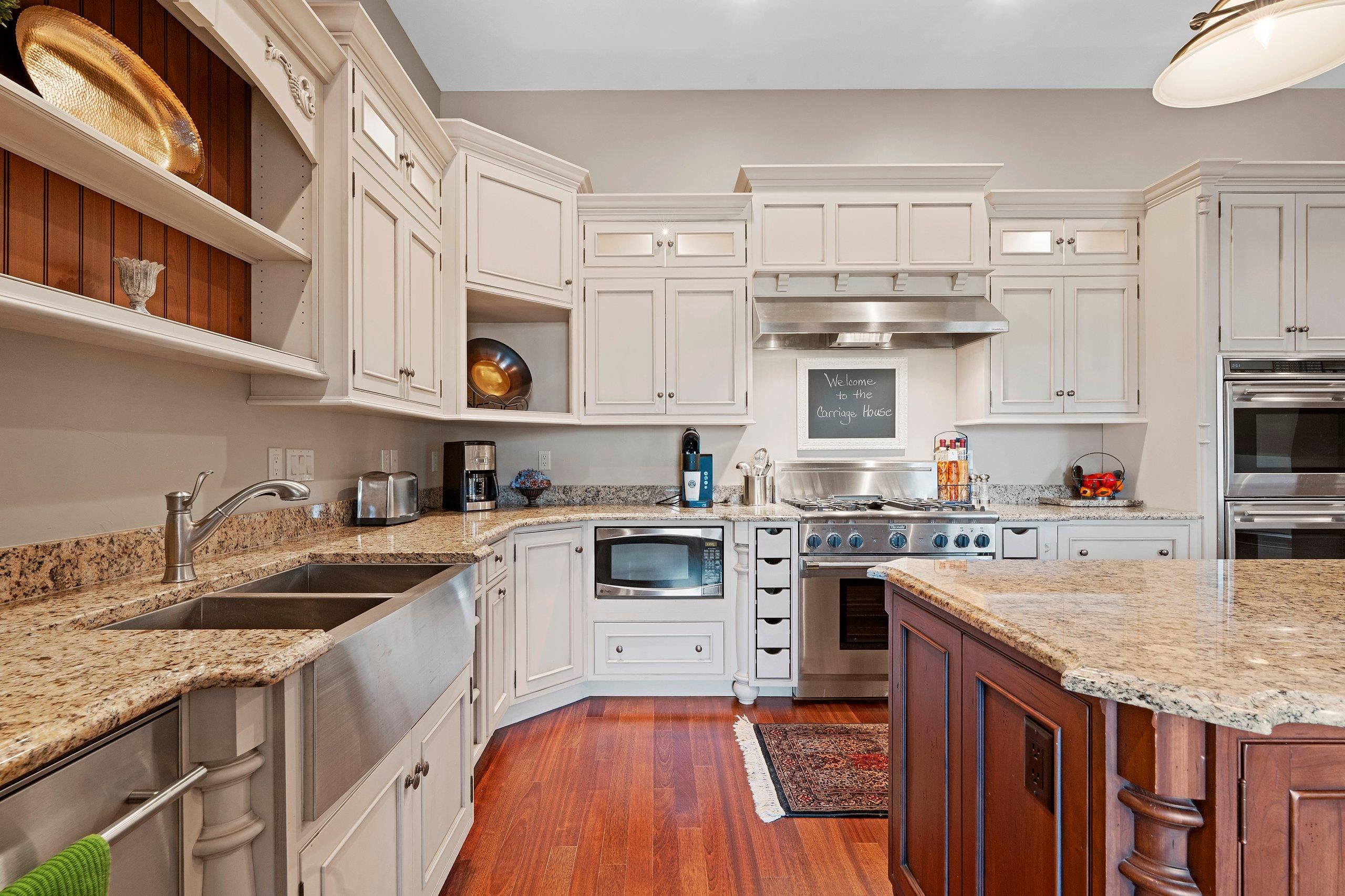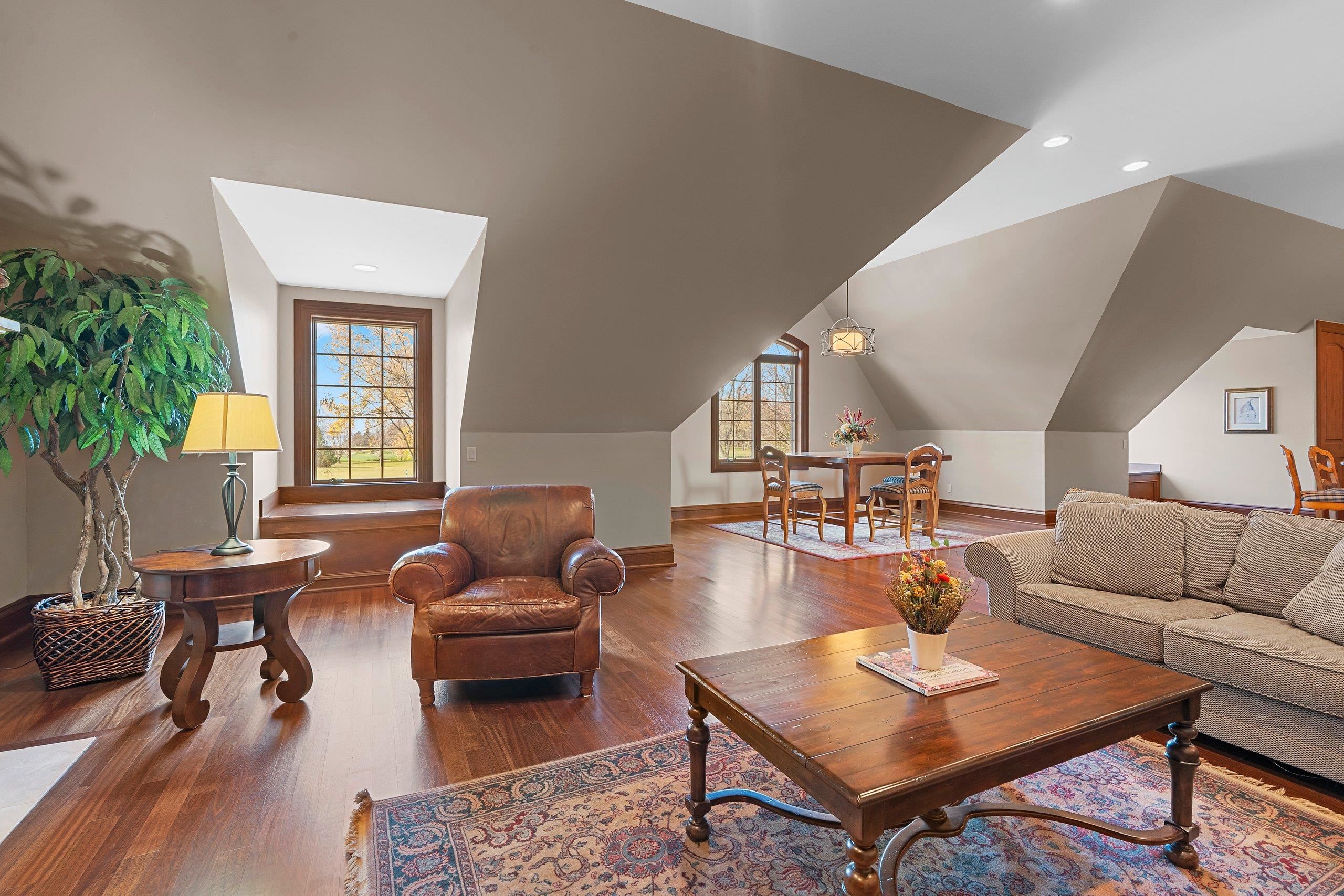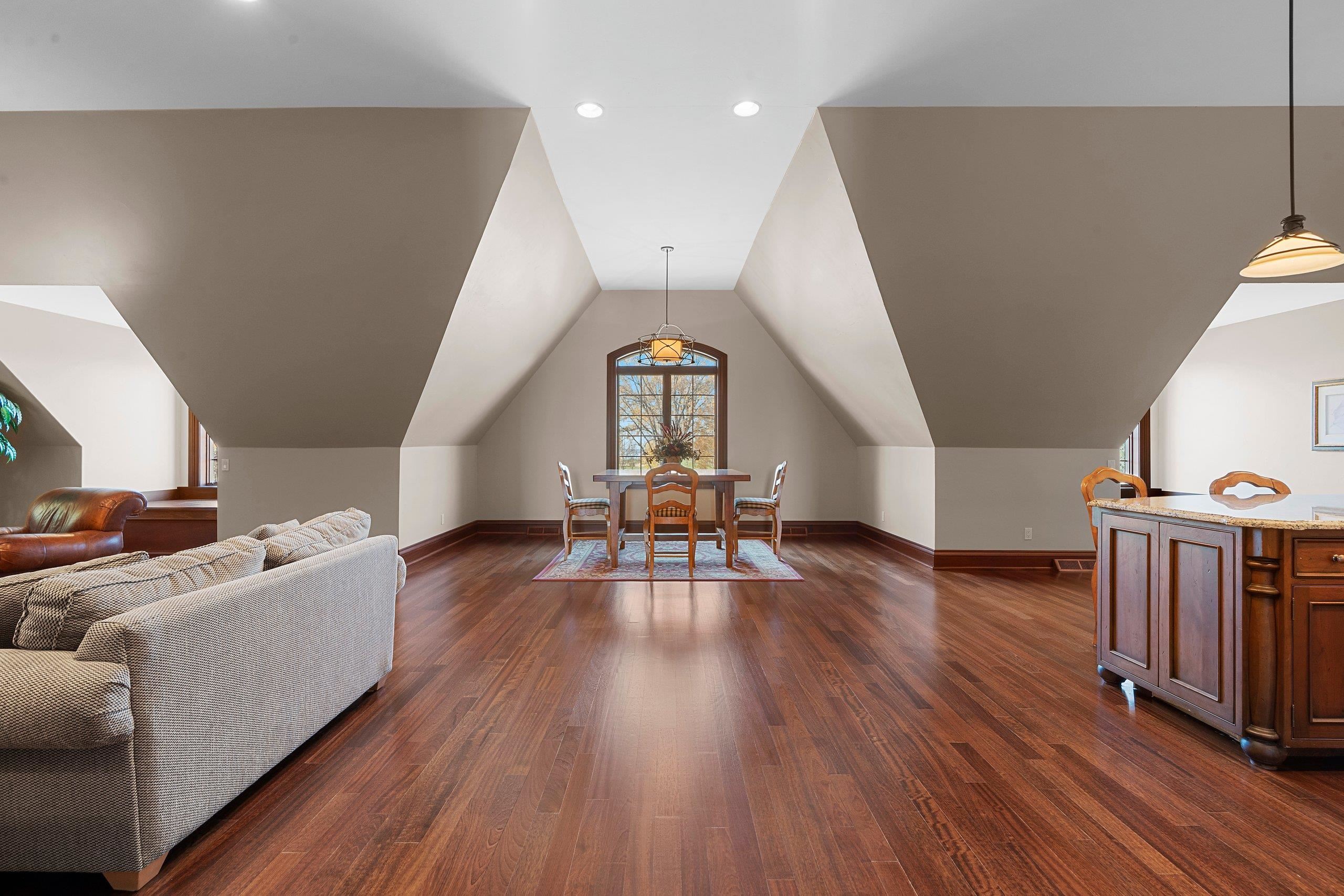 Welcome to the “Carriage House.” This truly one-of-a-kind design is sure to impress. The main level features a stunning living room and bar area w/rich dark woodwork, coffered ceilings, recessed lighting, & a granite bar that gives off a true top-shelf vibe, perfect place to unwind & entertain. This level is flanked by 2 separate heated 4-car garages, ideal for the car enthusiast. A half bath, office, and hobby room (3rd bedroom) complete the main floor. Upstairs, you’ll find volume ceilings, beautiful hardwood floors, 8' solid doors, 7" trim. The spacious kitchen offers high-end appliances and a large granite center island that opens to a cozy living room /FP. Upper level also includes 2 generous bedrooms, W/WIC and their own private full baths & Laundry.