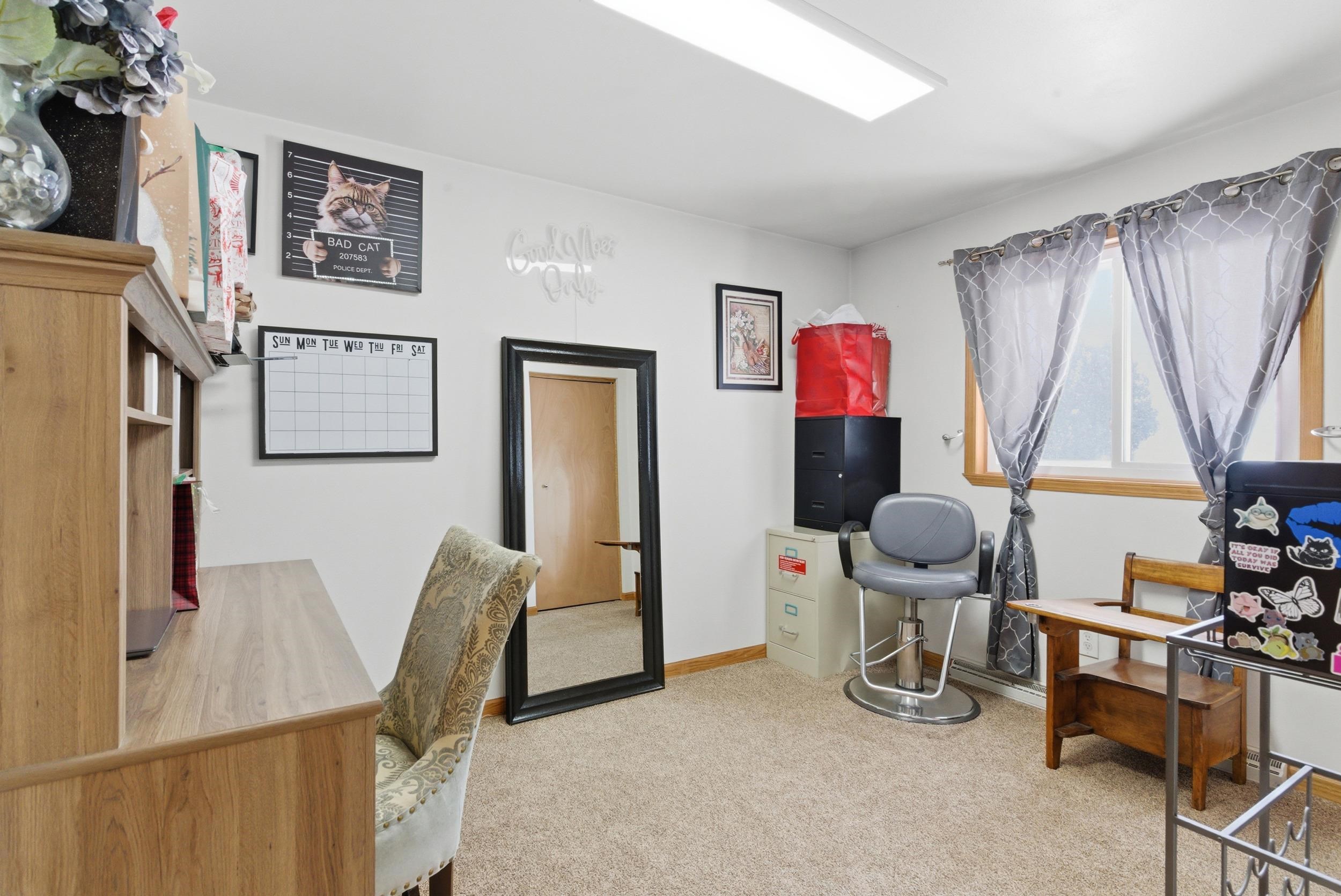 Curtains, Backyard Metal Fence, Black Wall Shelves in Entryway and Primary Bedroom.