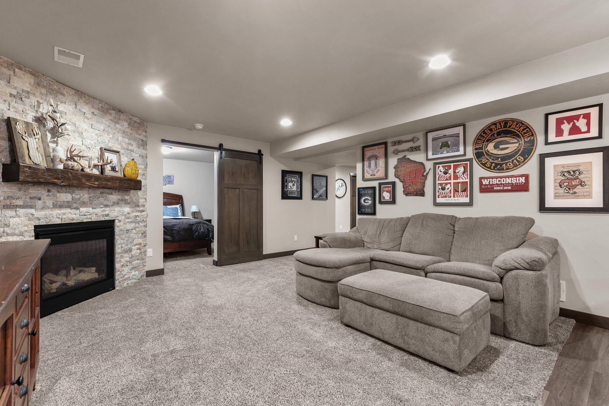 Welcome to your dream home! This elegant 5-bedroom, 3.5-bathroom two-story residence features a spacious 3-car garage, including an extra-deep stall. The bright living room boasts vaulted ceilings & a cozy fireplace, while the beautiful kitchen includes a large island, pantry, & stone countertops. First-floor laundry adds convenience. The primary bedroom features an ensuite bathroom with a walk-in shower & dual walk-in closets. Three additional bedrooms & a full bathroom can be found on the second floor. The finished lower level includes a bar area with a fireplace, a fifth bedroom, a full bathroom, & a bonus exercise room. Garage access is available from the basement. ALL drawers & cabinets are soft close, plus an in-ground sprinkler system with a weather station. Don’t miss this one.