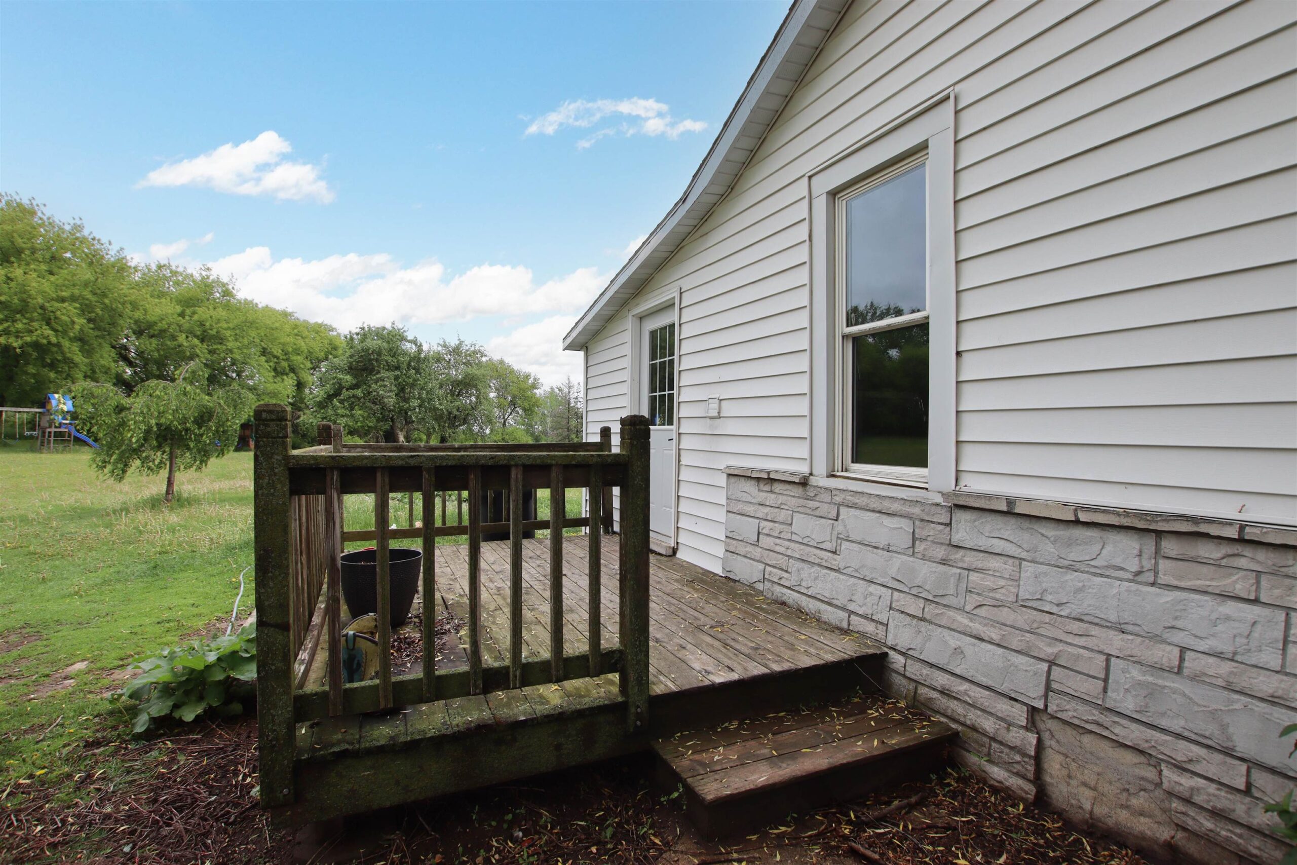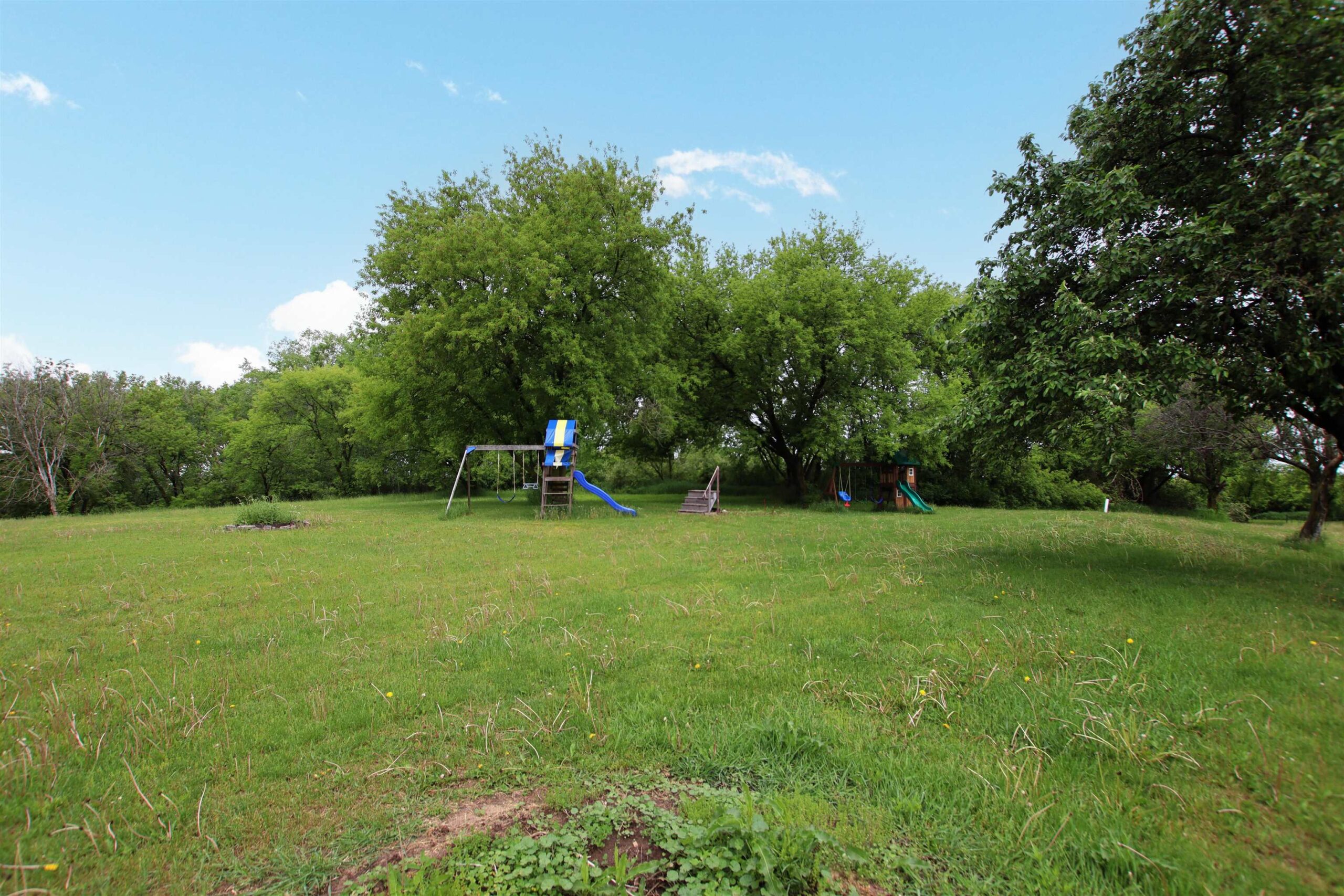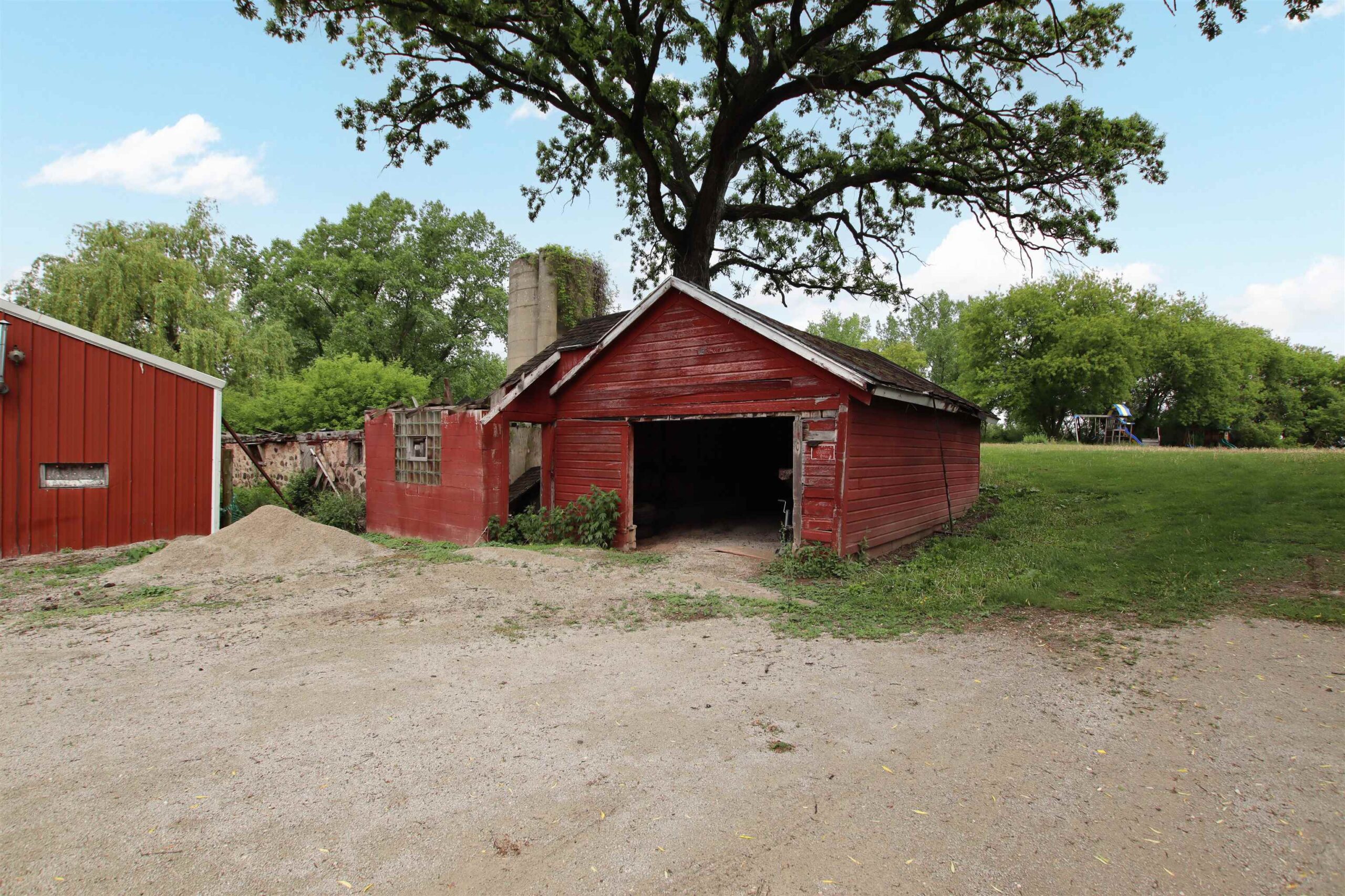 chest freezer and tall freezer in bsmt, new wood swingset, John Deere tractor in pole bldg
