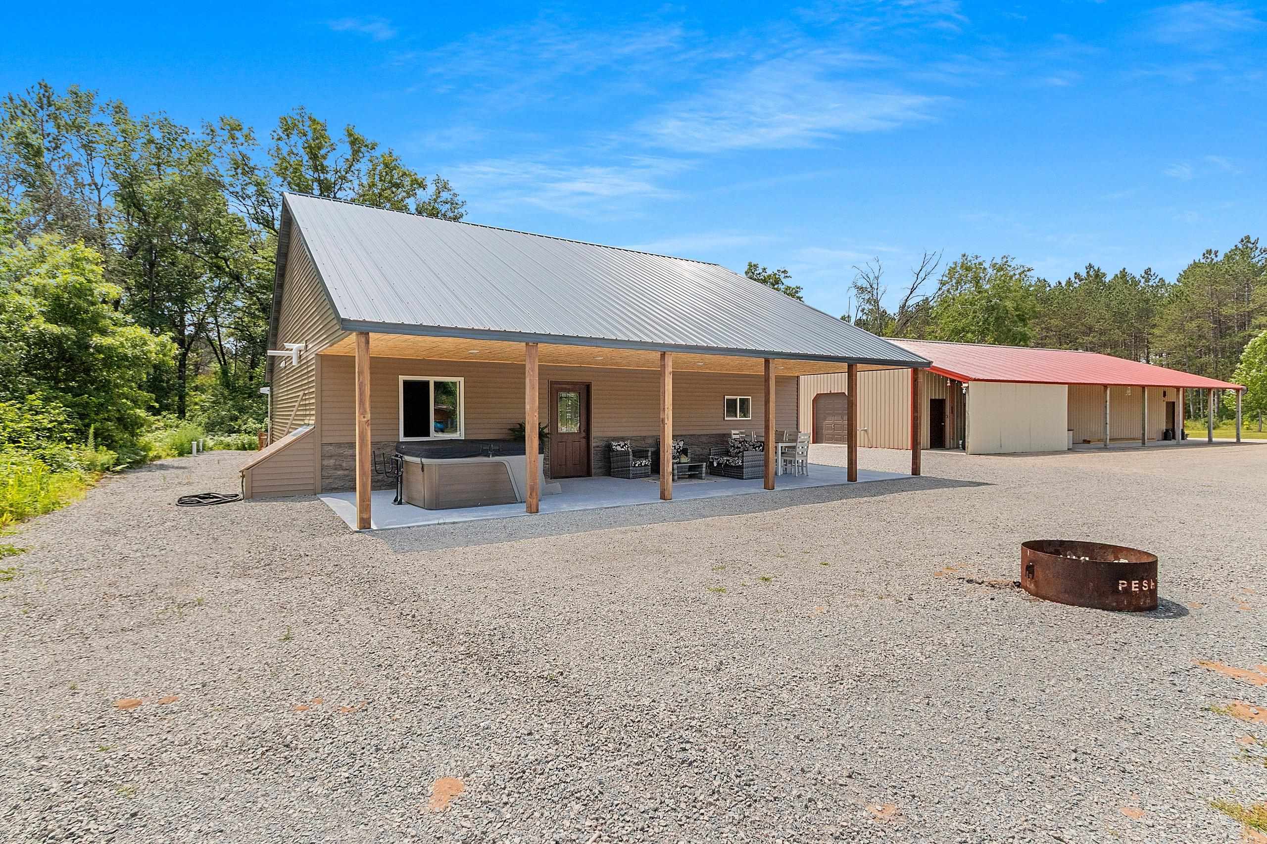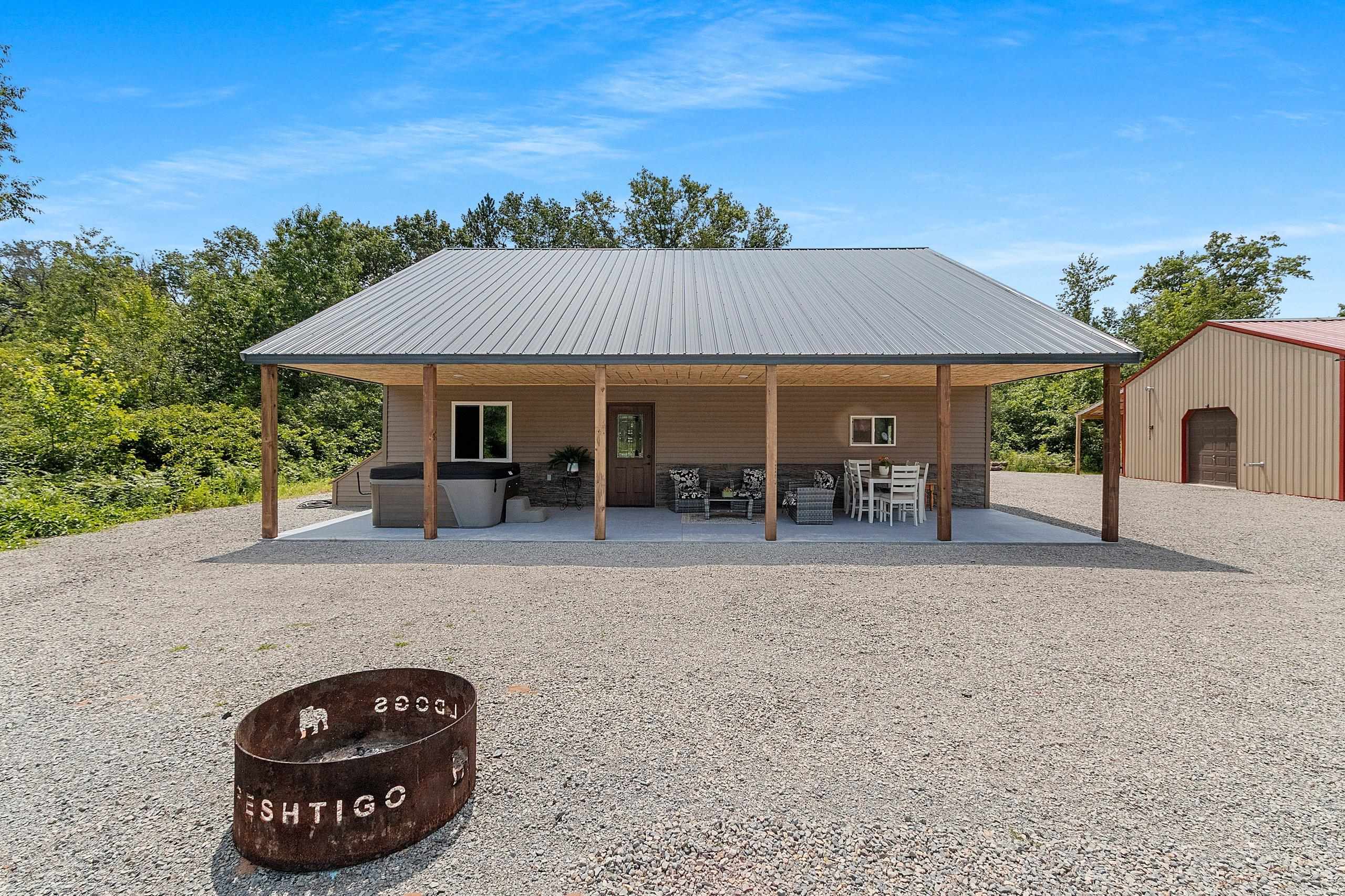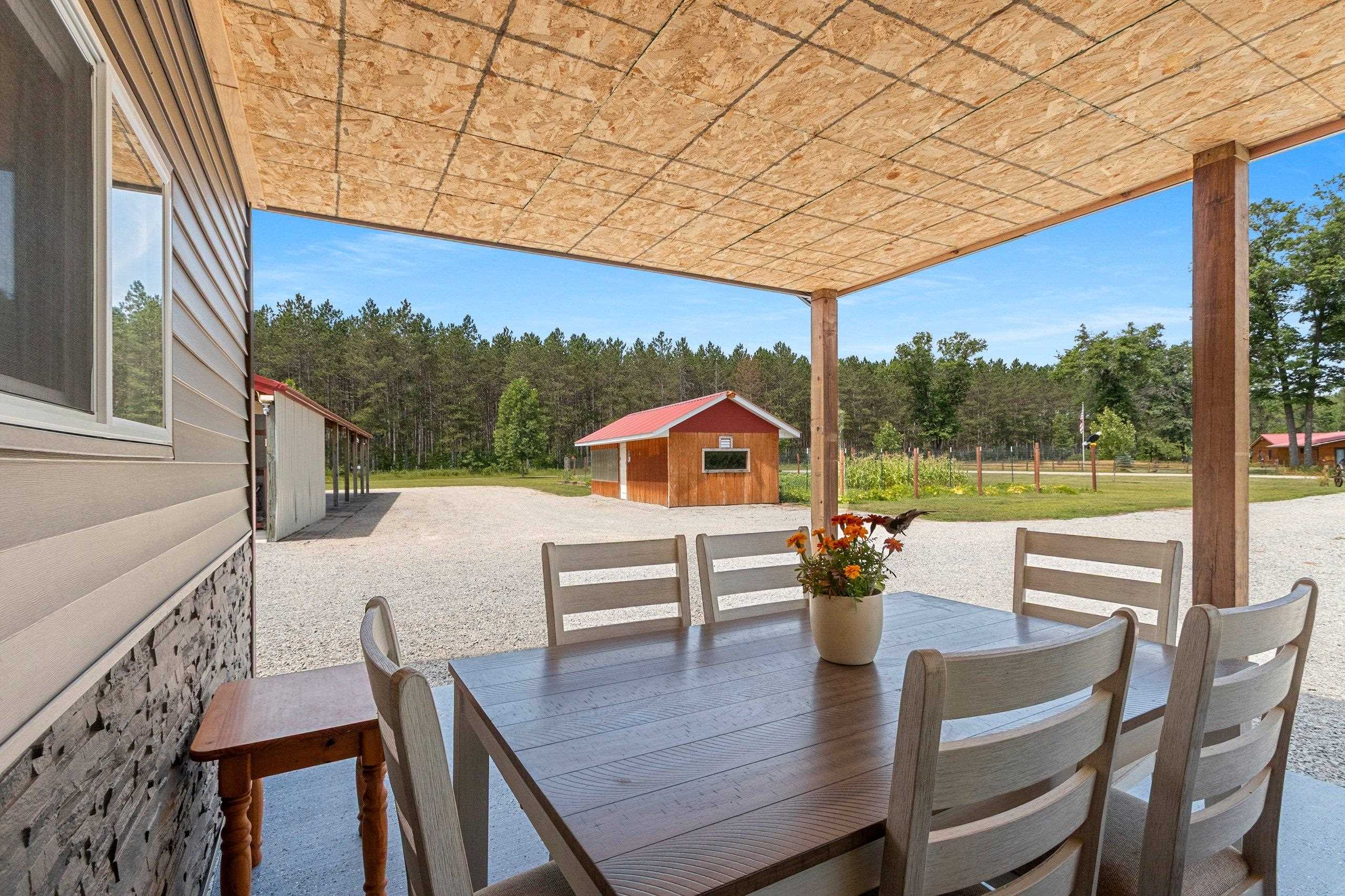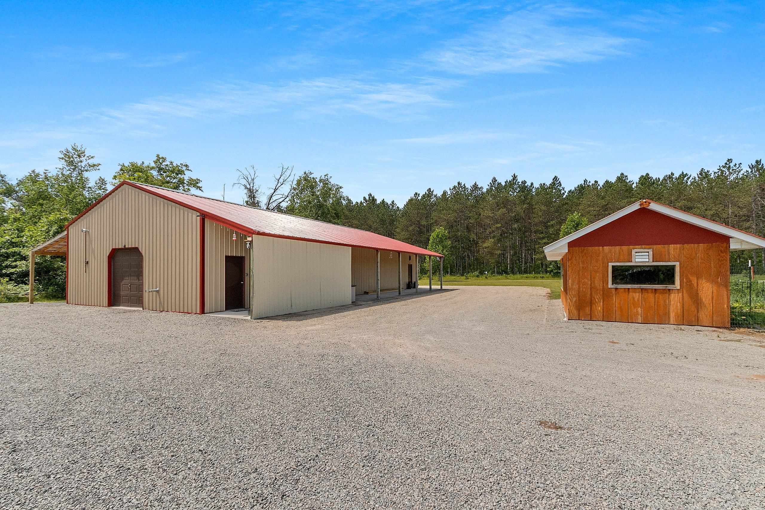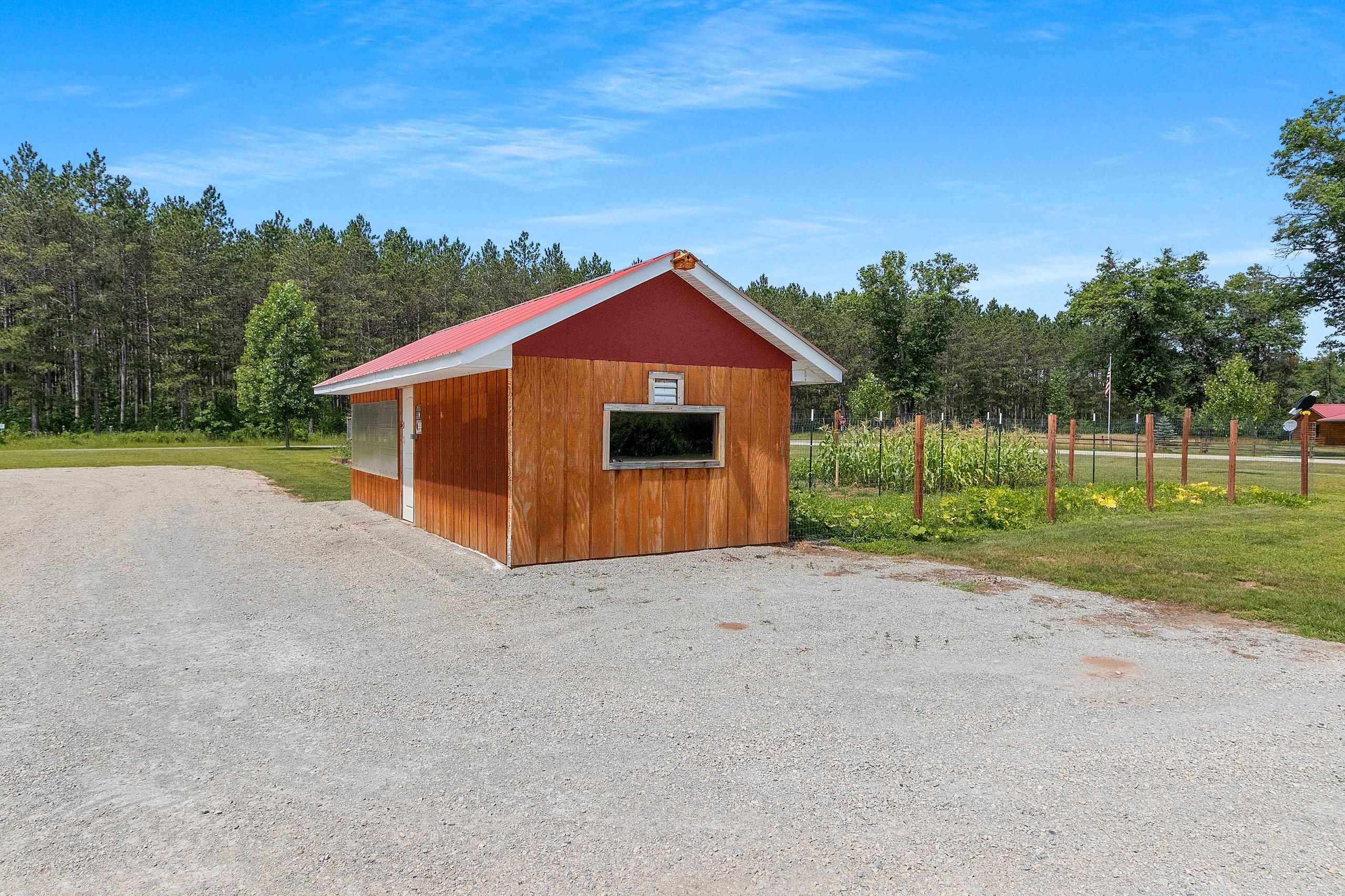 Northwoods Retreat: Cozy & Functional ], This newly built charming 2-bed, 2-bath single-story home with in-floor heating. Large open floor plan from kitchen to living room. Fenced in yard along with a large covered porch for entertaining. Enjoy watching the wildlife from your covered porch. Multi-purpose outbuilding (garage, workshop, storage), and a unique chicken coop/greenhouse combo. Minutes from boat landings, UTV and snowmobile trails. Ideal for peaceful living and year-round adventure. Three wells on the property; house, workshop, Greenhouse/ Chicken coop. Flooring in the house is epoxy coated. Workshop/ Garage outbuilding along with the Greenhouse/ Chicken Coop all have their own wells