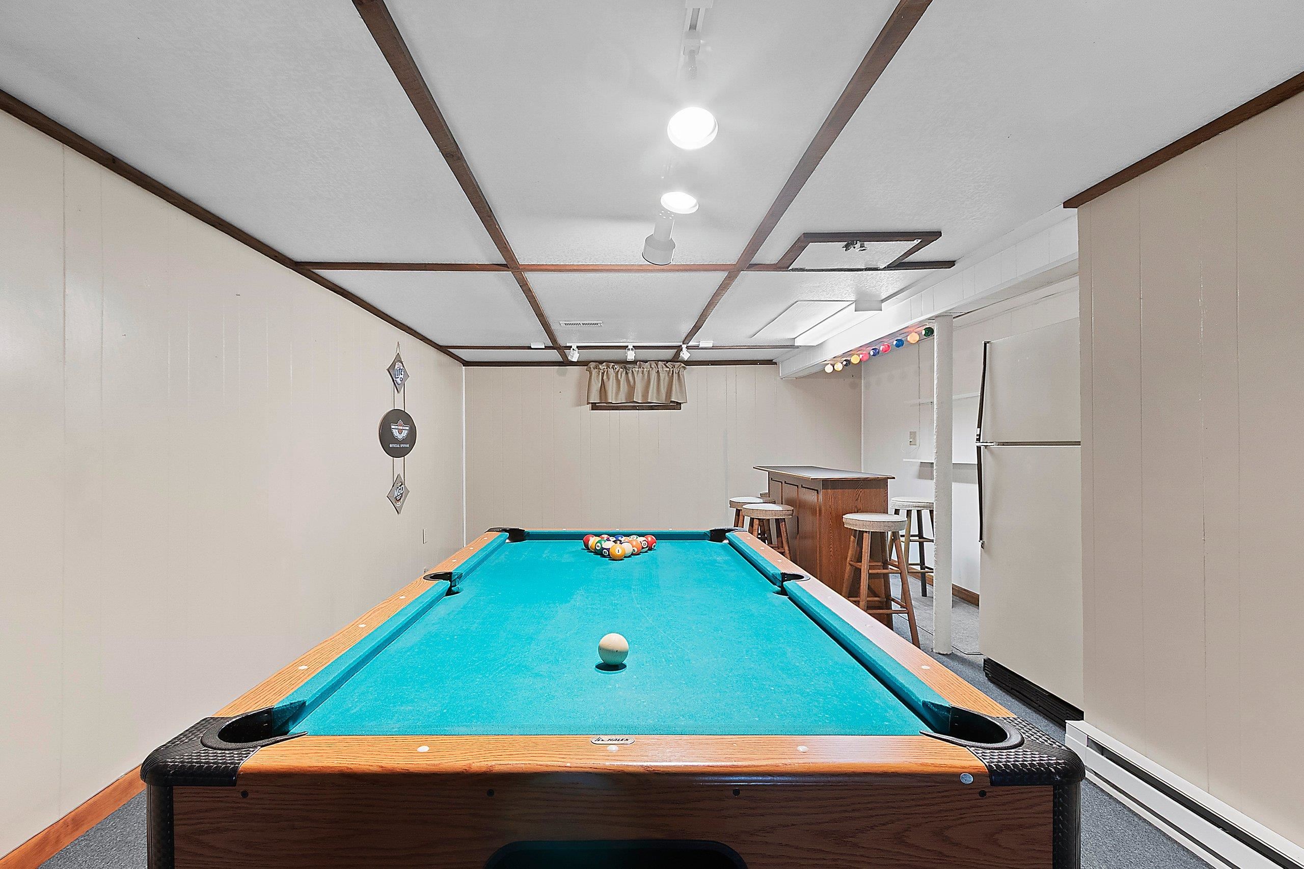 pool table, basement fridge, bar and stools, book shelves, love seat, desk and desk chair, washer/dryer, microwave, stove, refrigerator, dishwasher