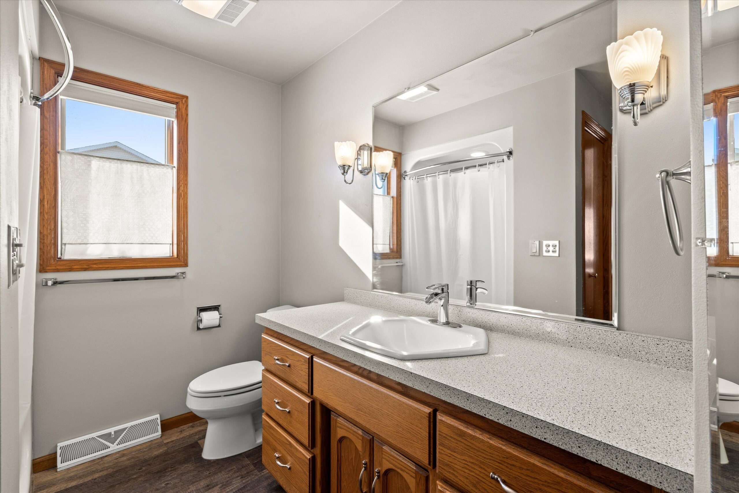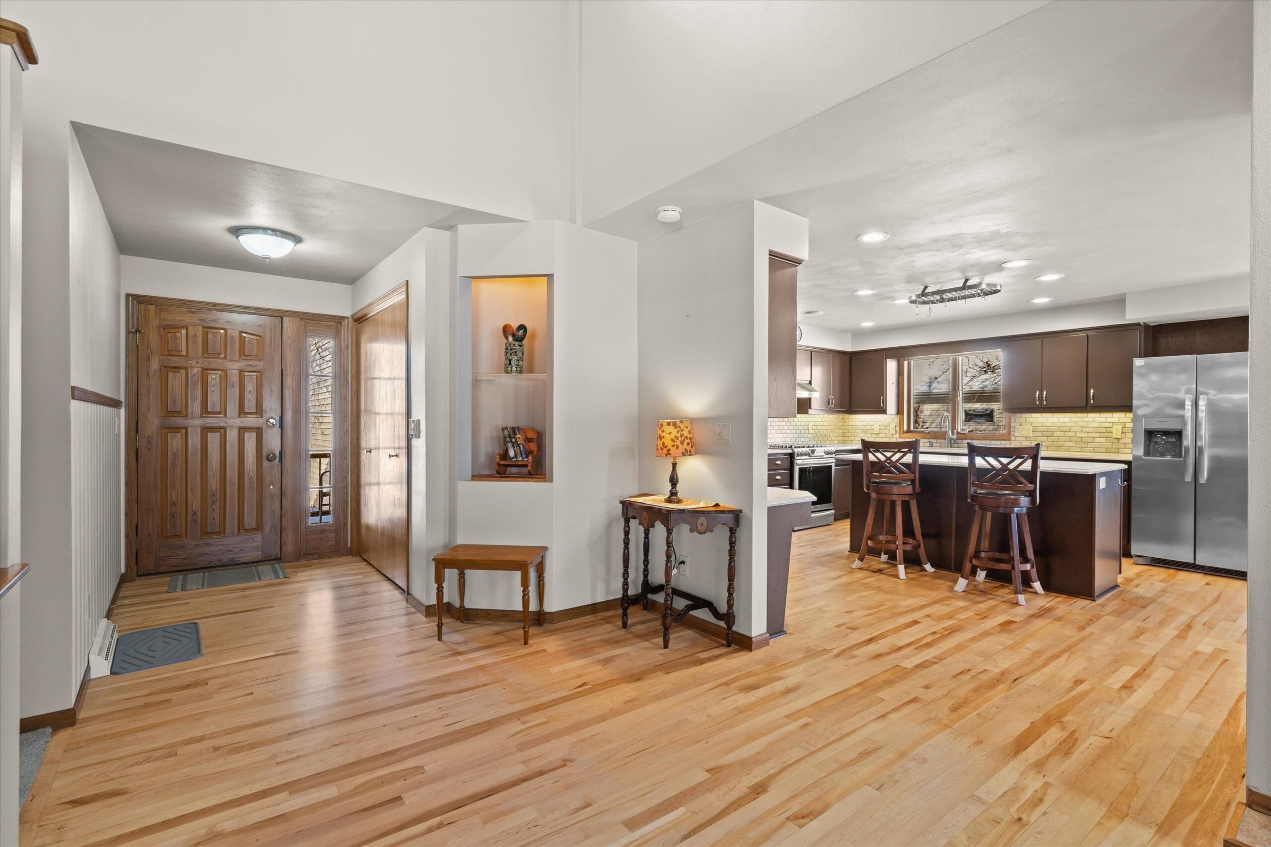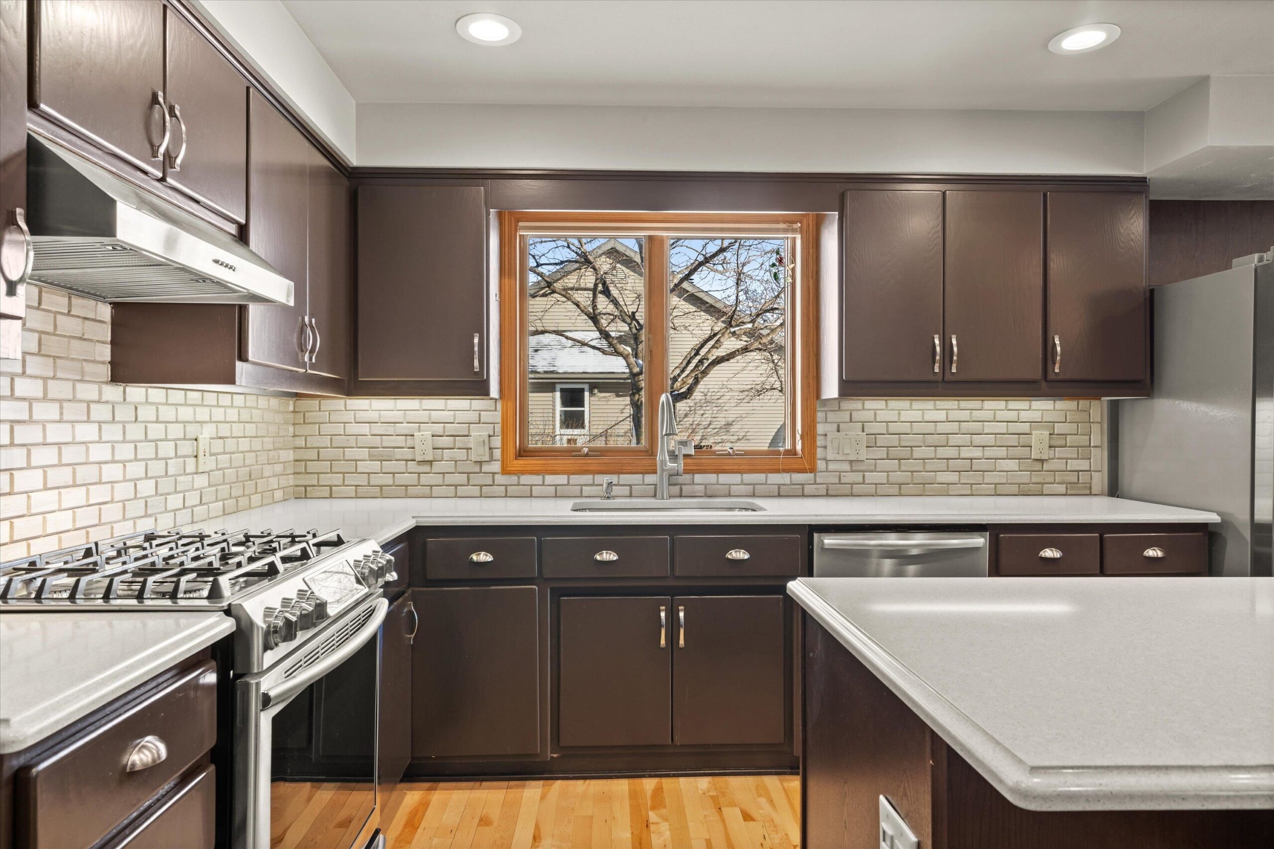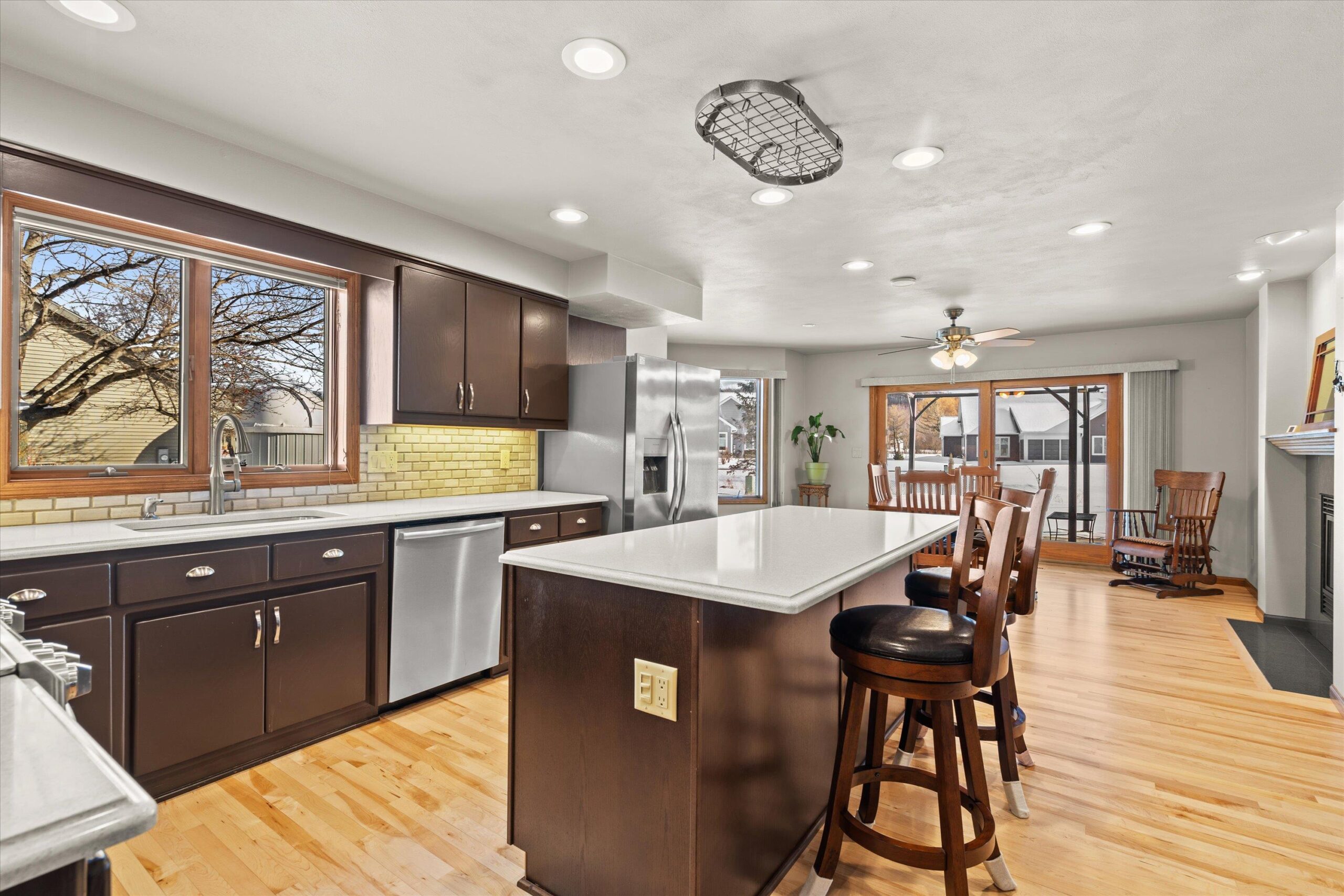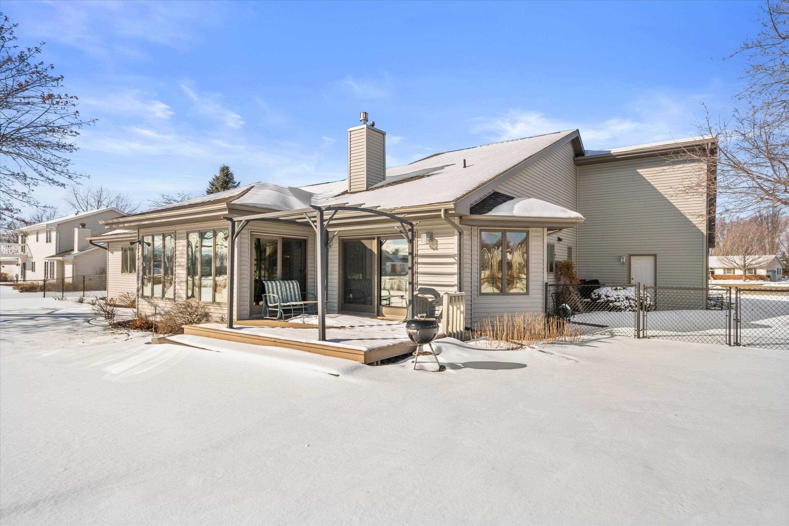 Nestled near High Cliff State Park and surrounded by walking paths and a golf course, this immaculate ranch shines with pride of ownership. Bright southern exposure floods the living room, dining room and four-season room beneath vaulted ceilings. An updated kitchen offers quartz counters, an island, and refreshed cabinetry. Step outside to a pergola-covered patio, fenced yard, tranquil stream and pond backdrop, an ideal blend of comfort and scenery.