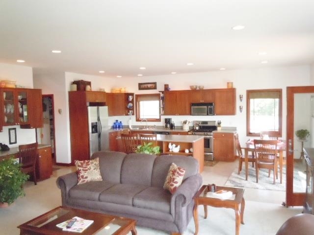 One-owner custom built home w/open floor plan & 9-ft. ceilings. Home situated on 38 acres only 20 min. to Madison! Spacious eat-in kitchen includes cherry cabinets,SS appl & pantry.Huge LR w/gas fireplace.Master includes dbl walk-in closets,master bath w/jetted tub.LL w/separate 1-car garage & entrance,full kitchen,master suite, sunroom w/walk-out to patio & den.Wonderful rec rm,mother-in-law suite or college kid hideout.2 laundry rooms.40x30 shop w/water,electricity & heat.Land w/2 ponds,CRP & leased land.