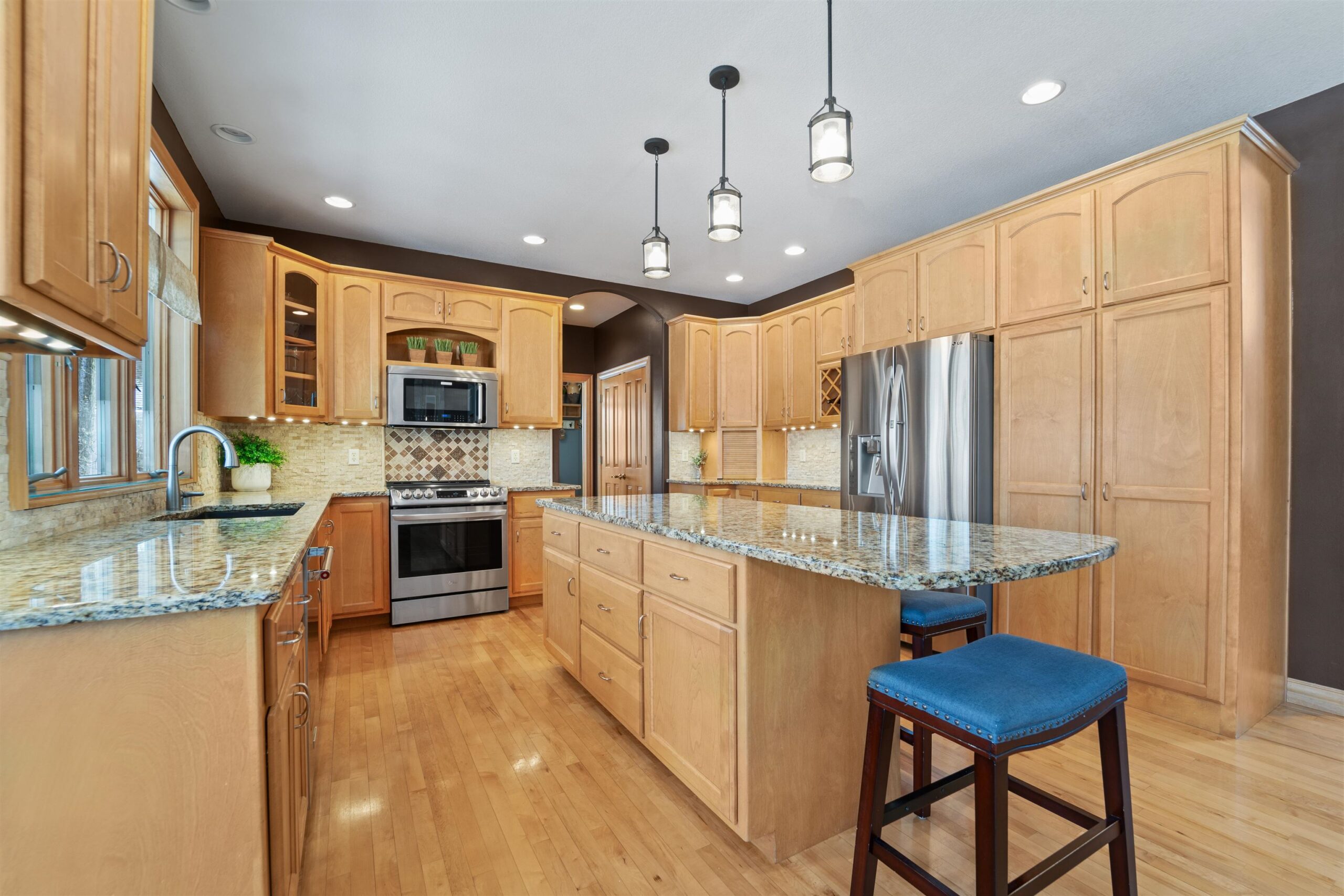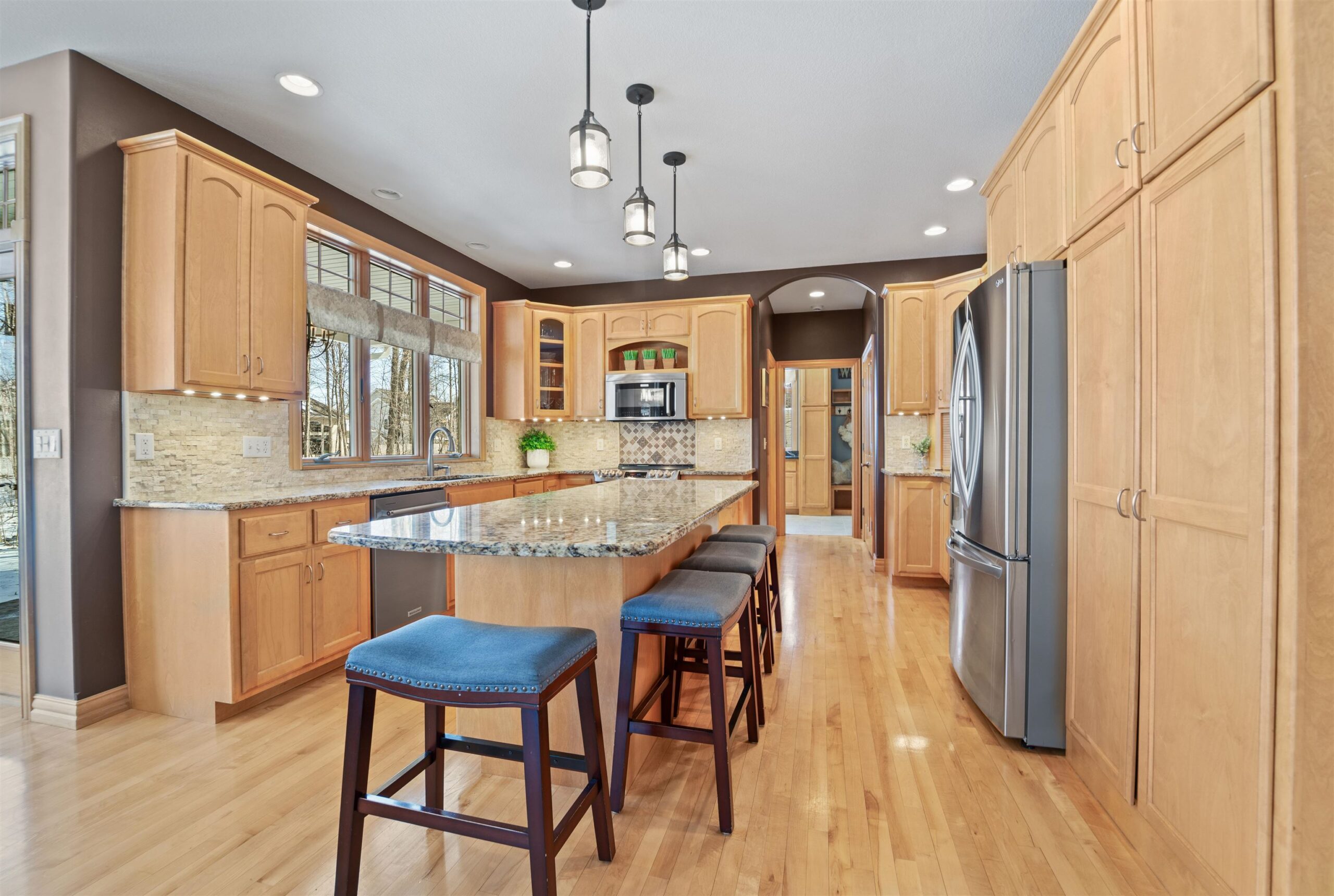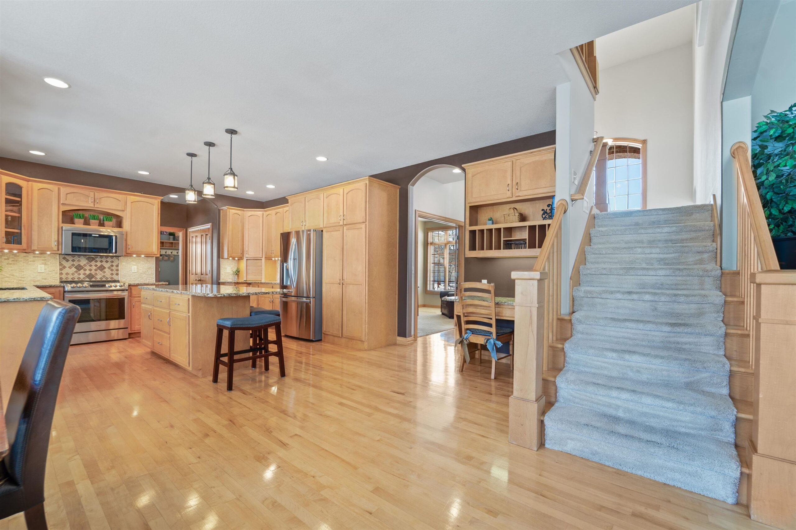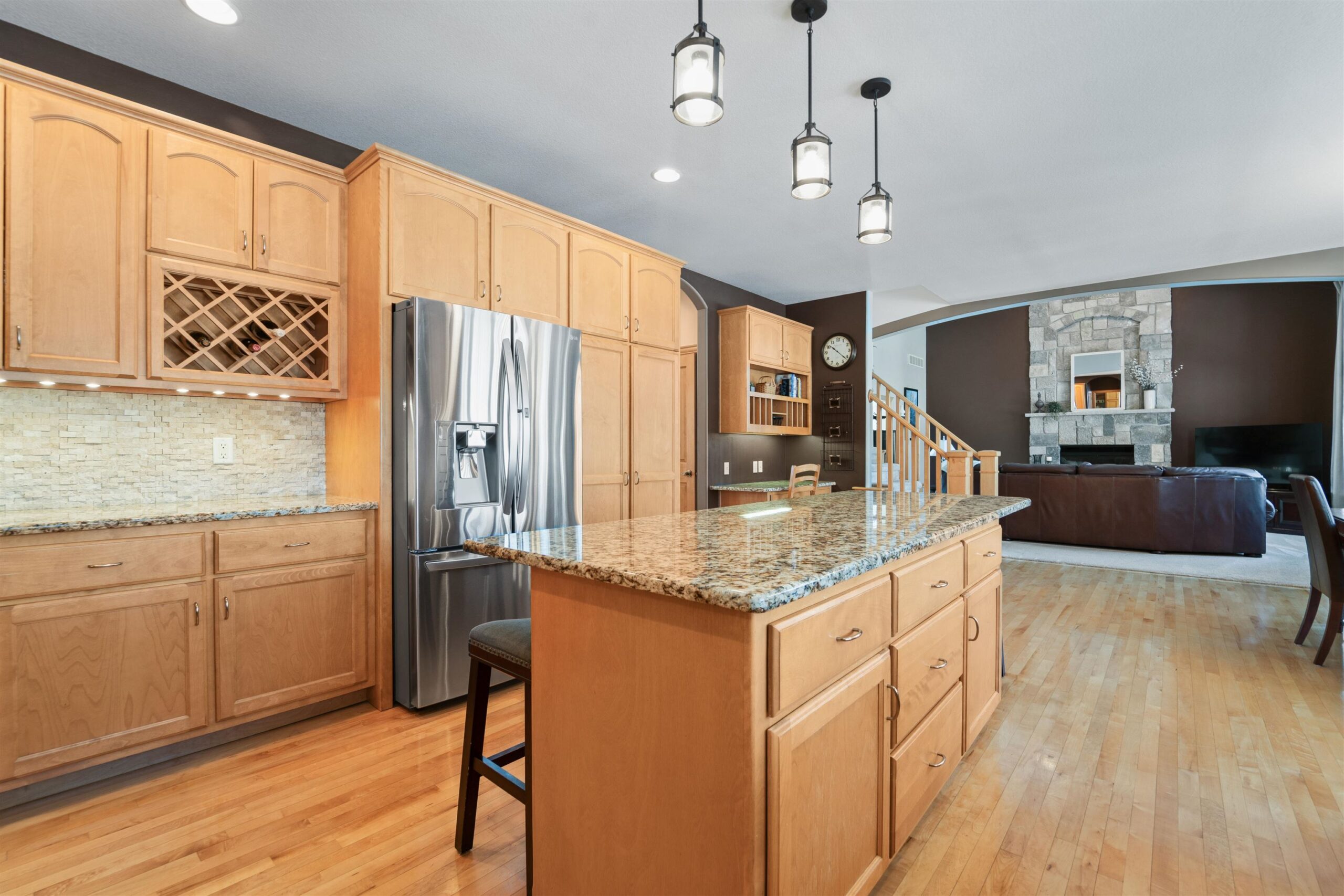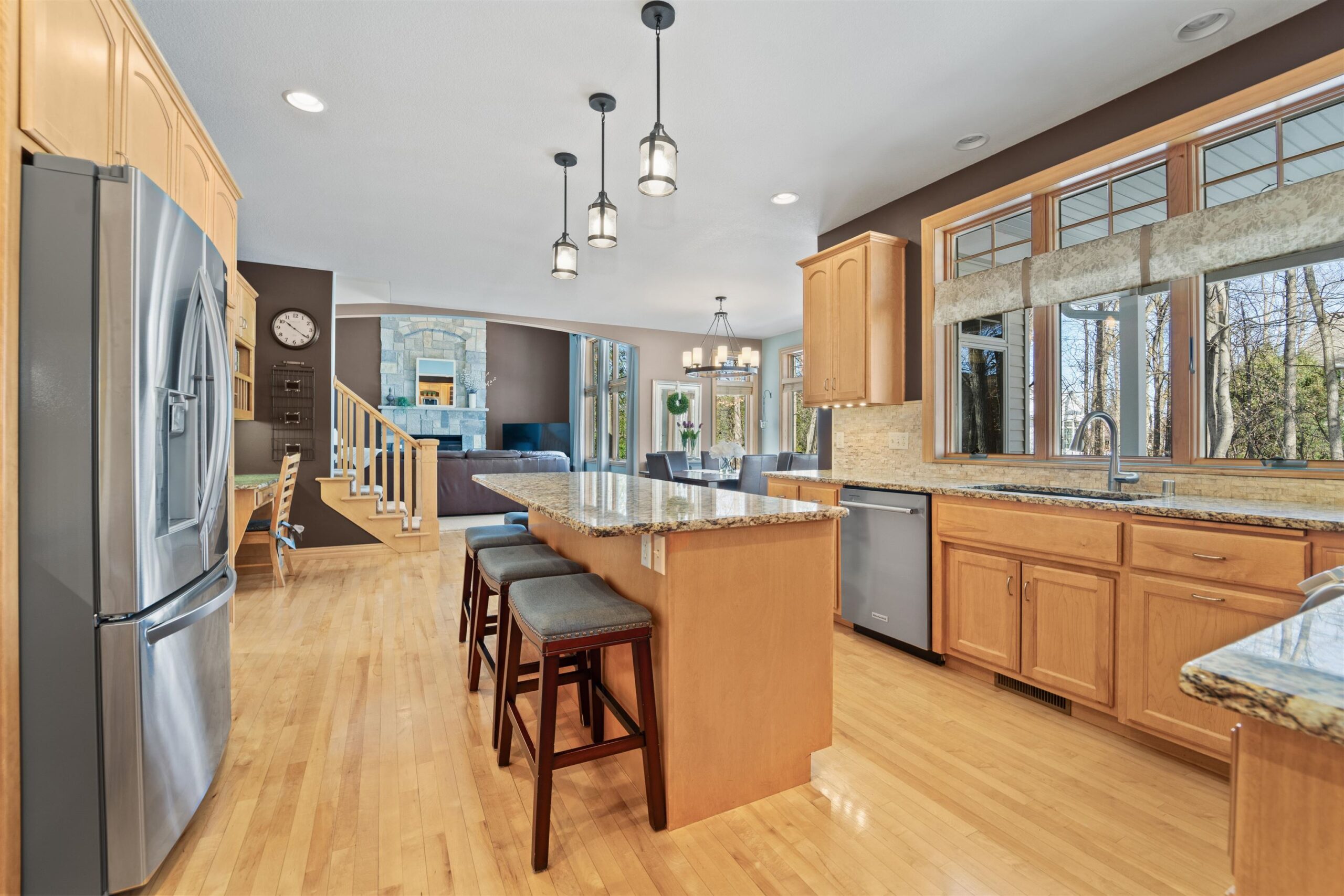 Luxury meets lifestyle in heart of Kimberly Schools, tucked into a wooded backdrop is this immaculate one-owner home with quality updates. 2 story foyer & gorgeous L-shaped split staircase. Large office with French doors & hardwood floors throughout. Updated kitchen with granite counters, center island, maple cabinetry & SS appliance package. Soaring great room with stone wood burning fireplace and large windows. Relax in sun drenched family room. 4 large bedrooms up, including primary w/heated floors & walk-in closet. Mud room/laundry room off garage. Lower level with full wet bar, rec room and family room with gas fireplace. Outside enjoy a covered patio and mature landscape. Access to trails and park. Pre-certified w/ 1 year warranty. Seller requires 48 hours for binding acceptance.