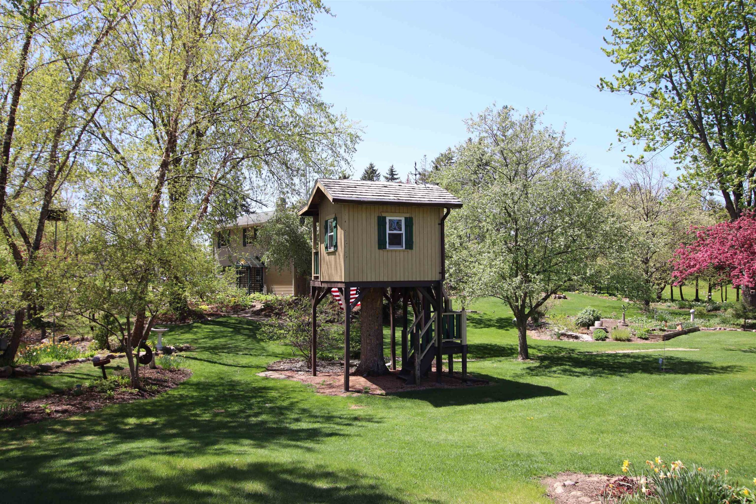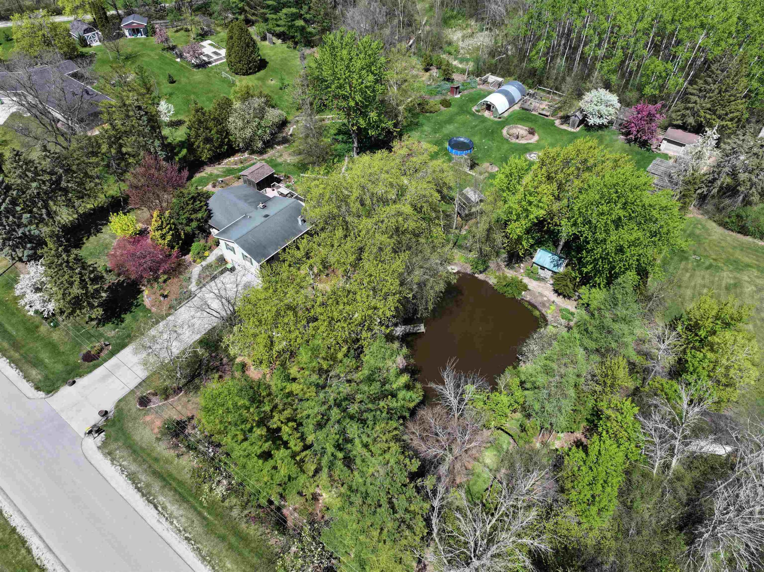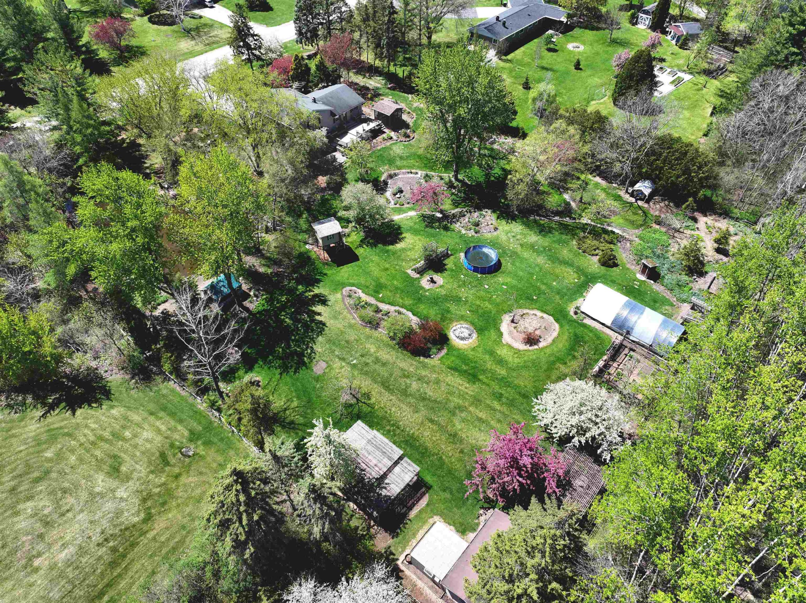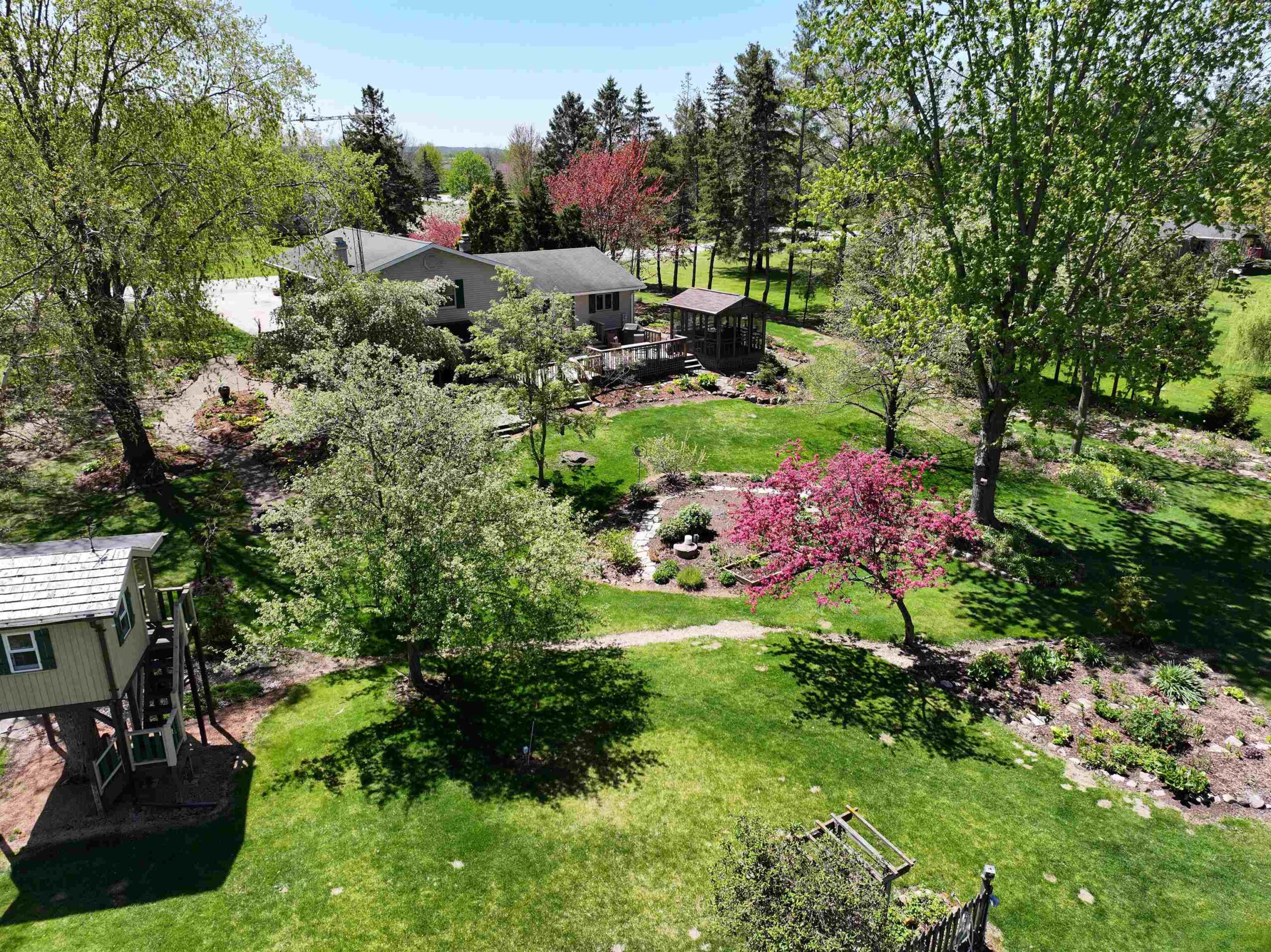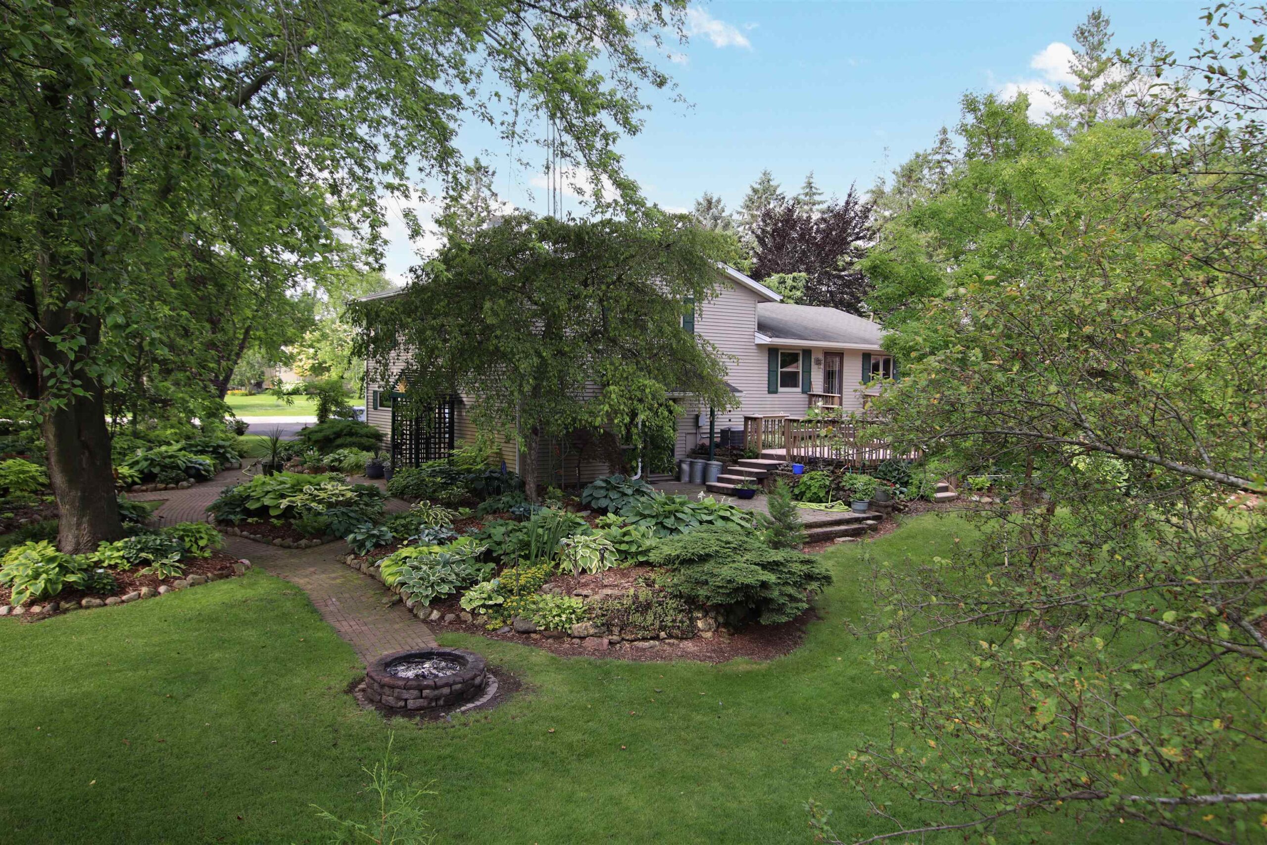 1.7 Acres & Pond! Don't miss out on this truly unique & charming split level home! Boasting 1,680 sq ft with 4 beds & 1.5 baths & 2 car attached garage, this home is full of character inside & out. Step inside to find updated kitchen cabinets, quarter sawn oak & beautiful engineered wood flooring. The kitchen features solid stone countertops, built-ins w/ appliance package. All 4 bedrooms are conveniently located on the same level, including the primary bedroom with a huge walk-in closet. The finished walk-out lower level is perfect for cozy nights by the wood-burning fireplace with a stunning stone surround. This 1.6+ acre lot feels like a sanctuary with a 17 ft deep aerated pond, playhouse, gardening sheds, storage buildings & a hoop-house providing privacy & peaceful views.