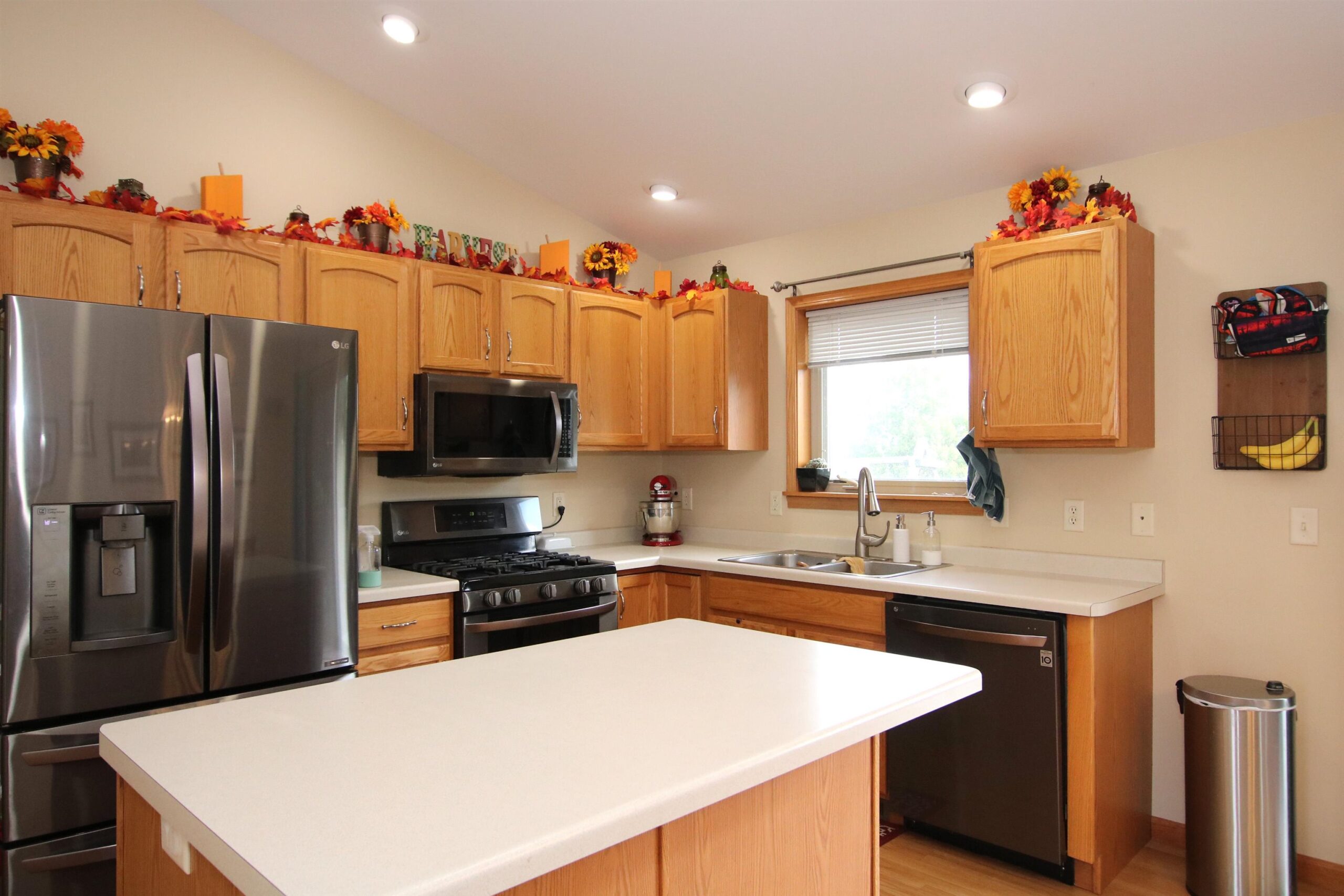Kitchen fridge, stove, microwave, dishwasher, water softener, blinds, curtain rods, curtains (except kids rooms)