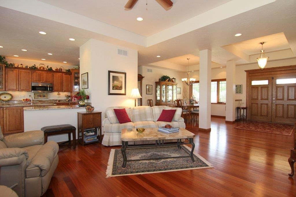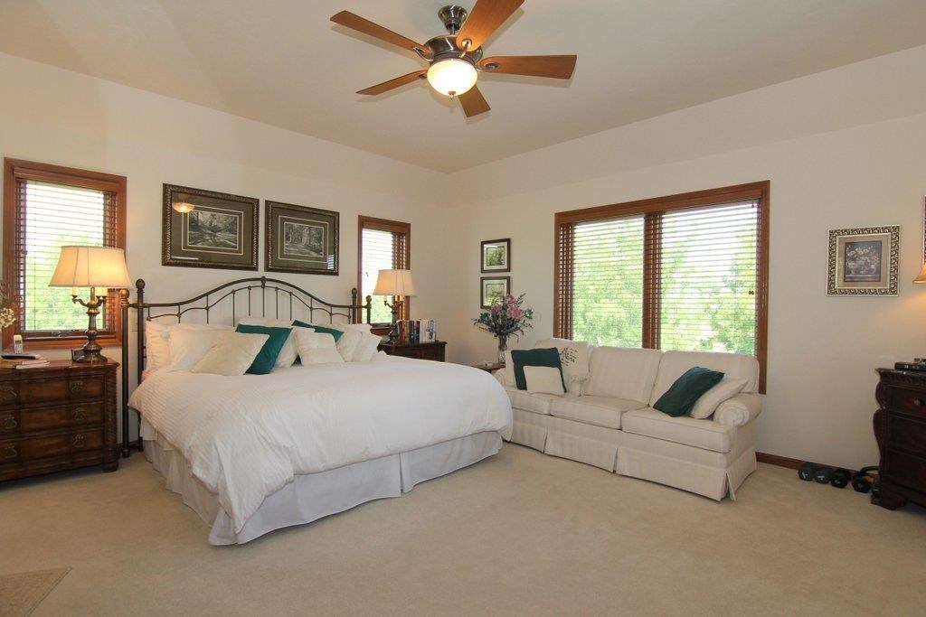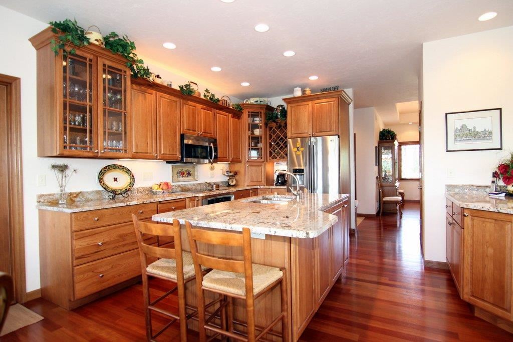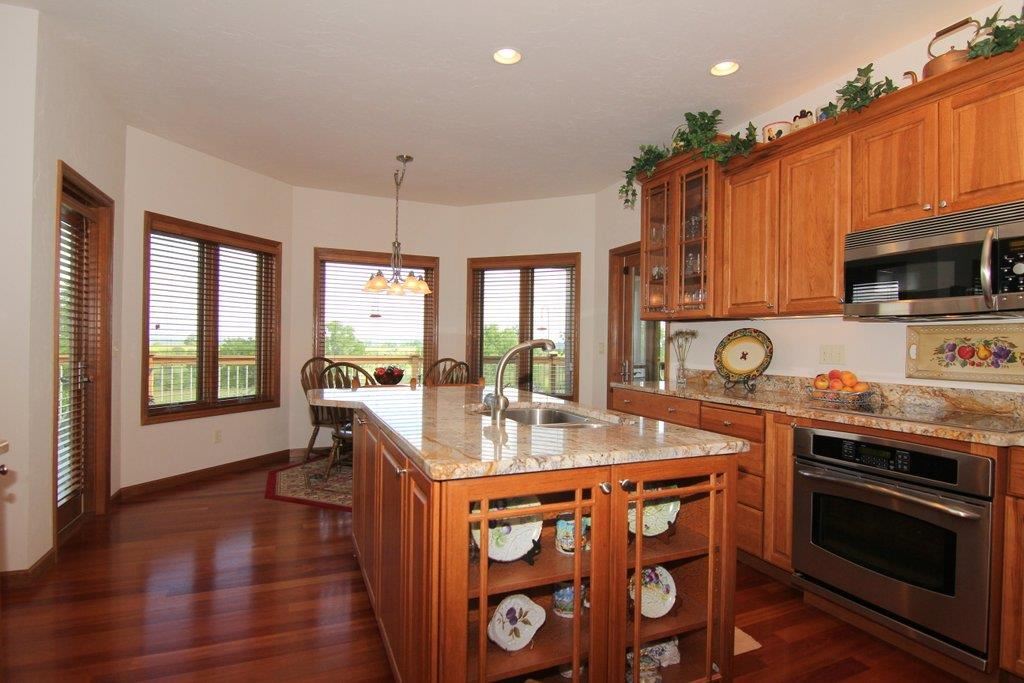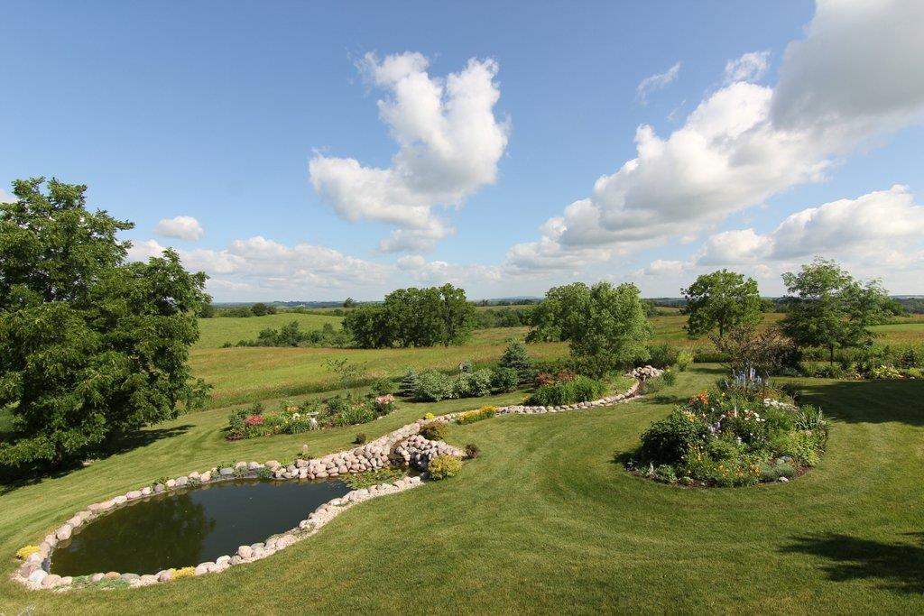 Breathtaking views from your own slice of heaven! Custom-built on 2+ acres w/all the best. Amazing 4BR ranch has open floor plan to maximize views of countryside & distant Blue Mounds. Brazilian Cherry floors & pecan cabinetry throughout. Spacious kitchen w/Stainless appl. & granite counters. Stunning Lower Level Rec. rm. w/impressive granite & stone wet bar, 2nd stone FP, 2 BR & Media rm. 2-tier deck & screened porch span entire back of home. Complete w/Koi pond & creek fountain. 6+car attached garage.