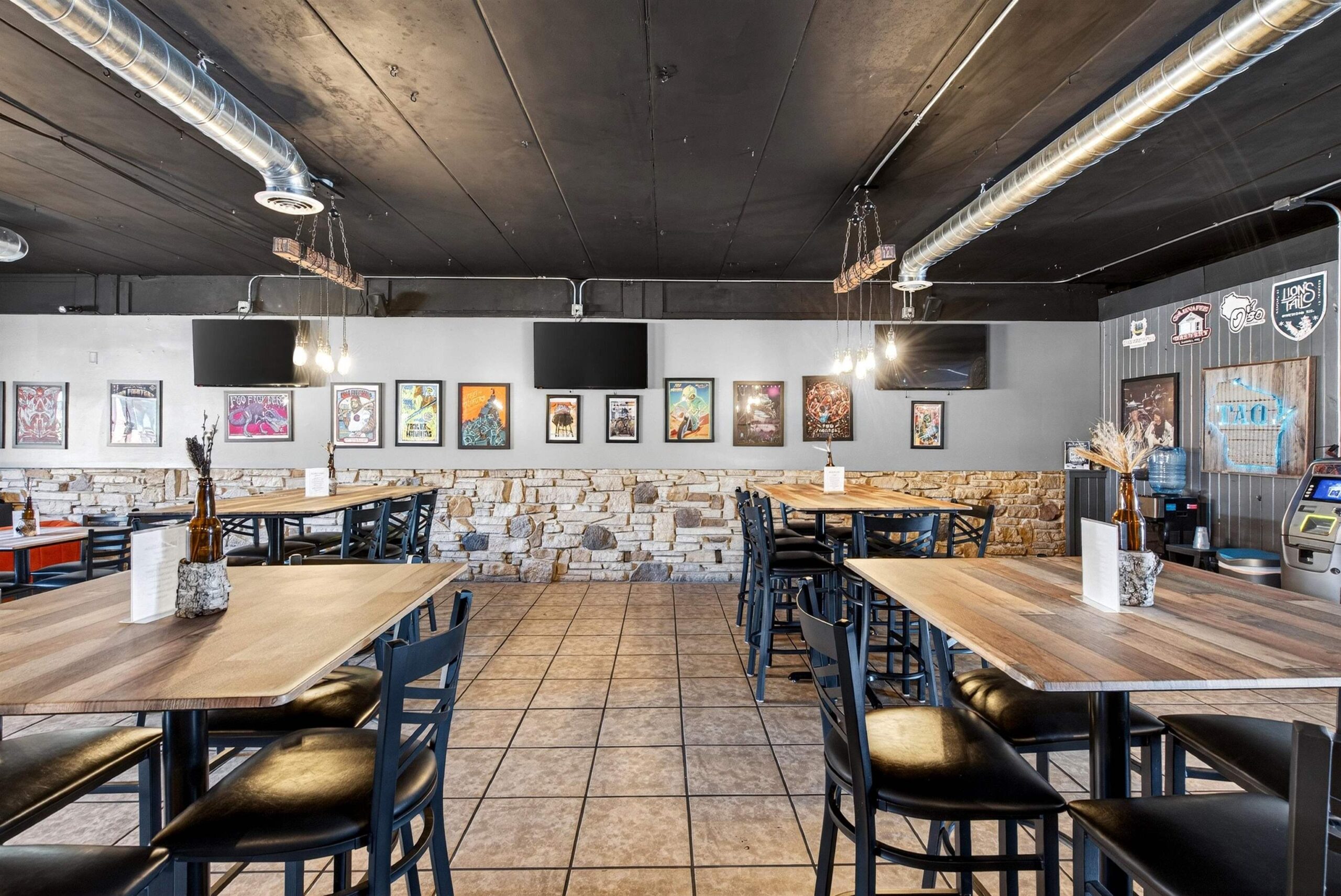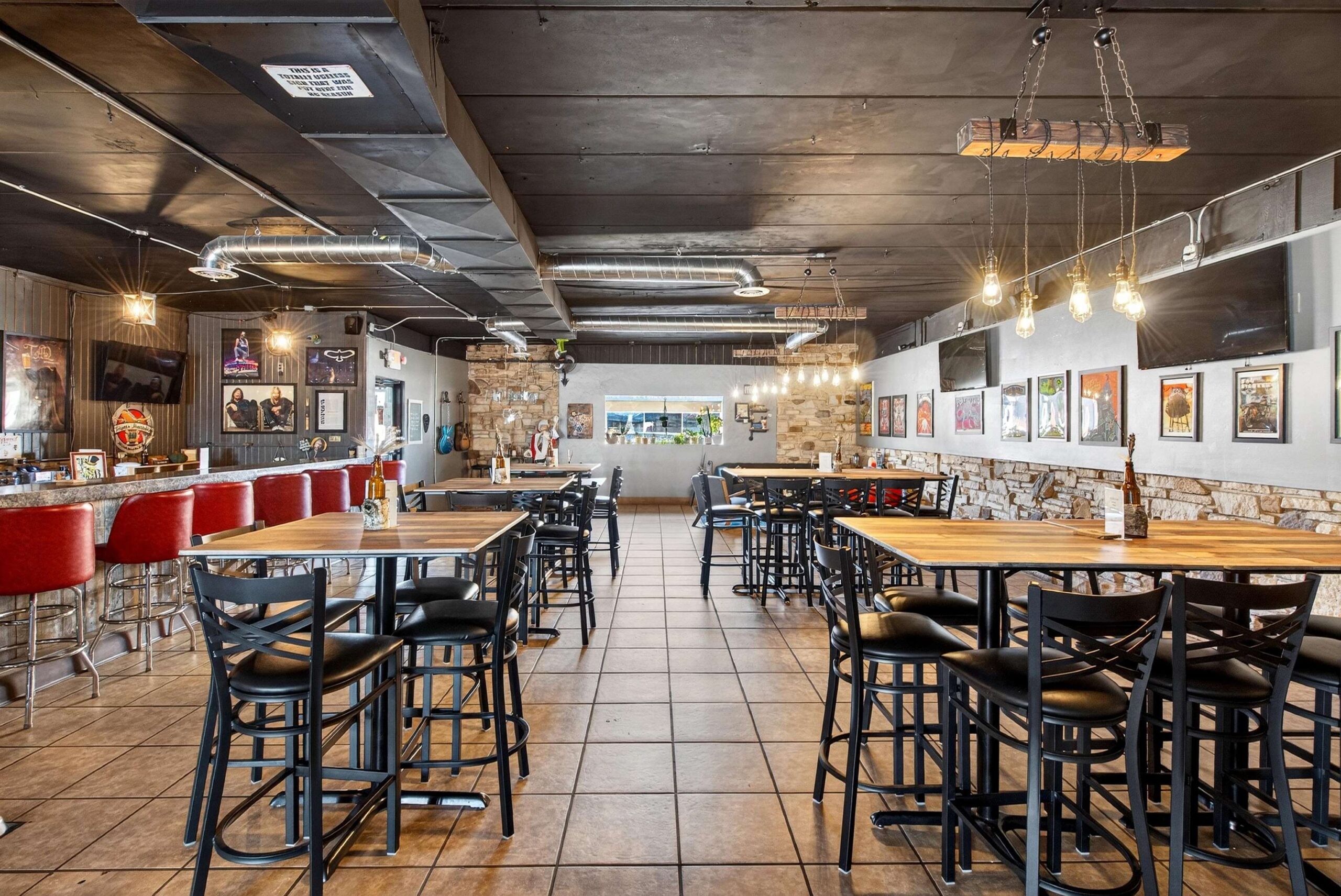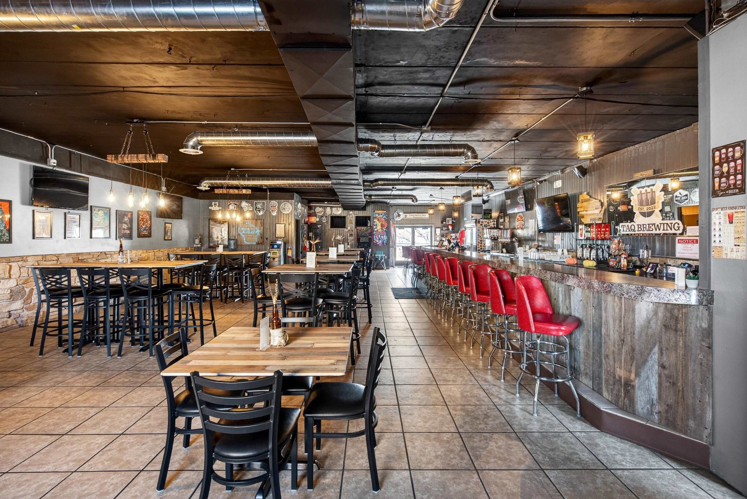 3 TVs on SE wall across from the bar, red barstools