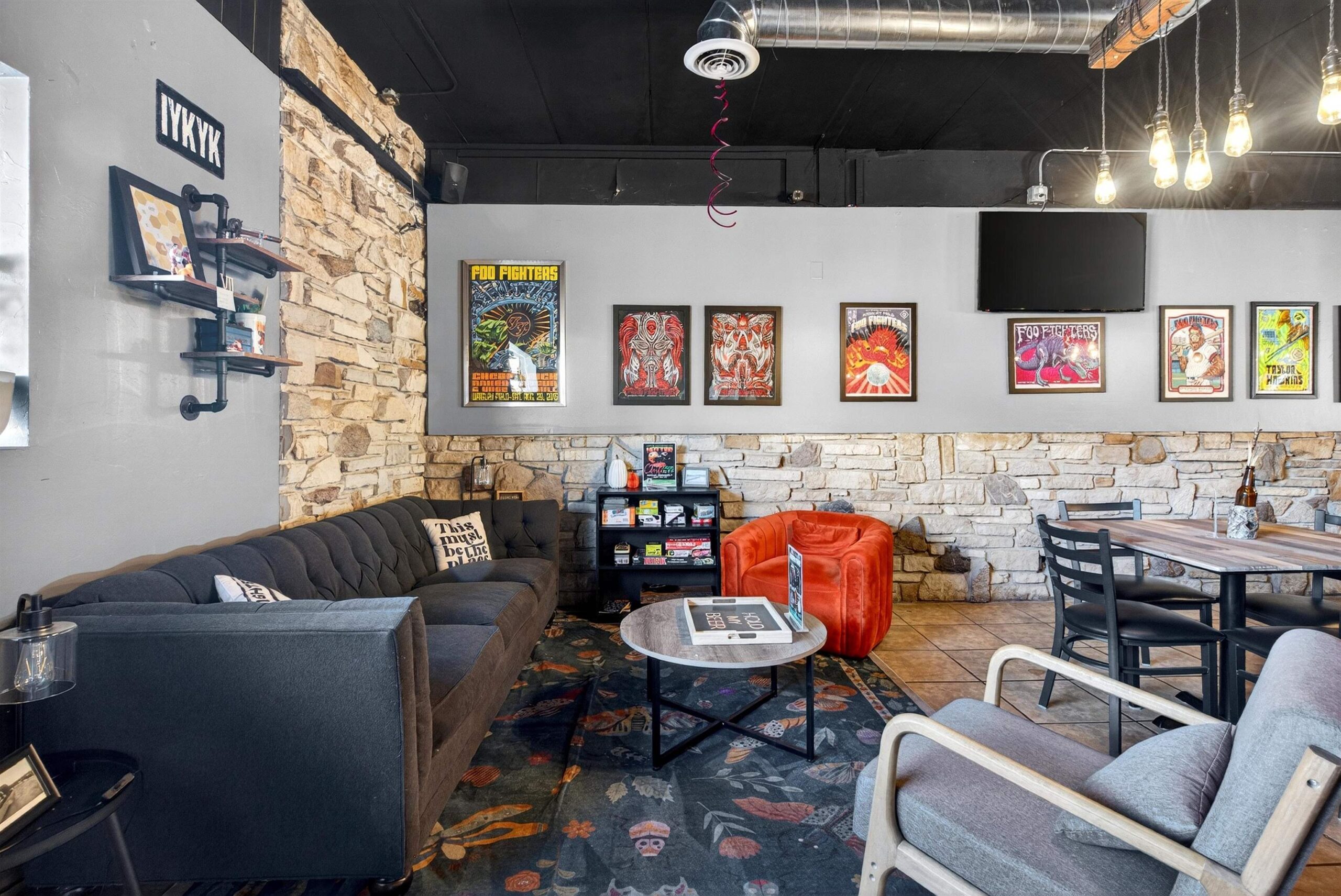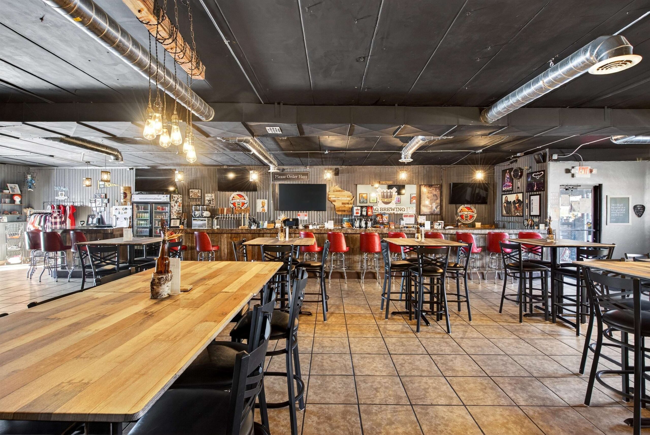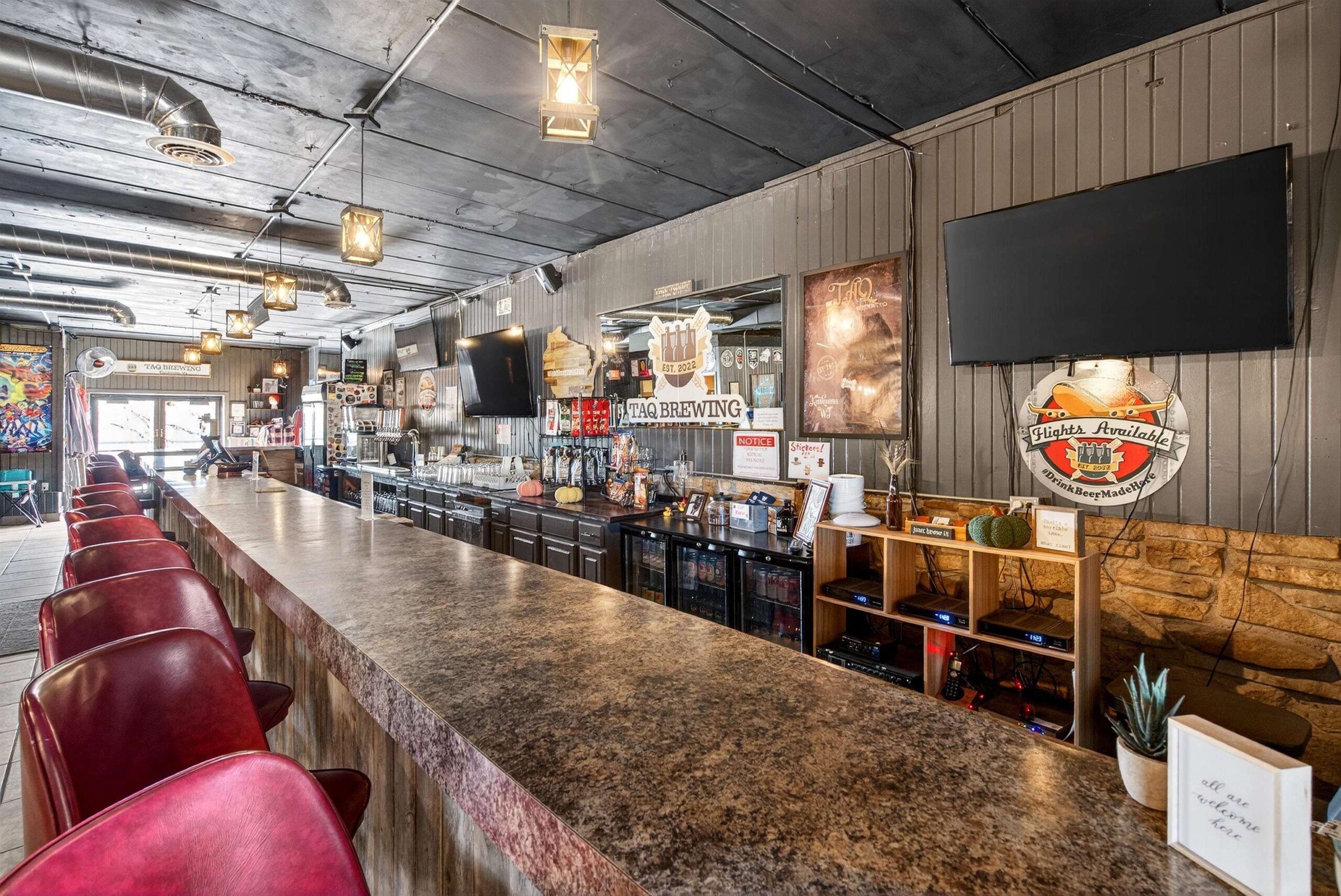 3 TVs on SE wall across from the bar, red barstools